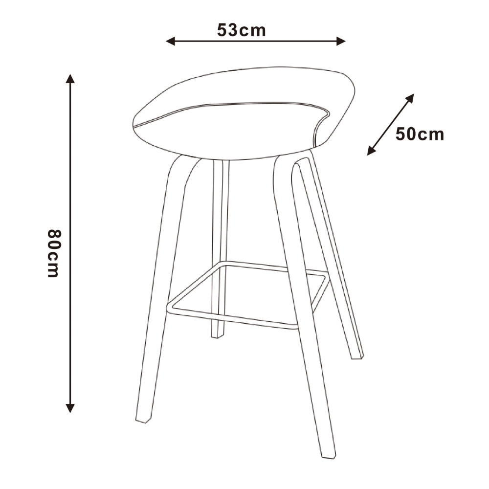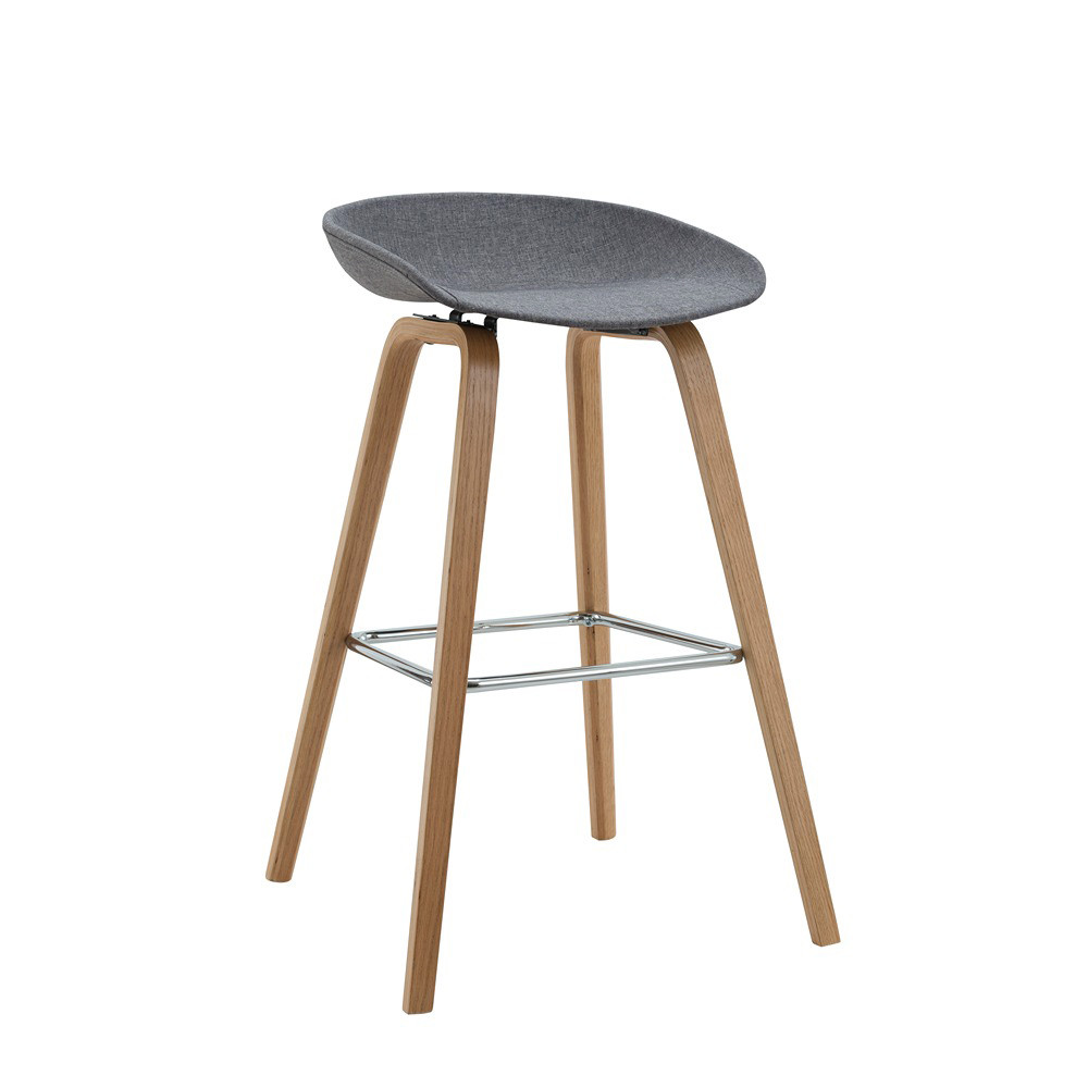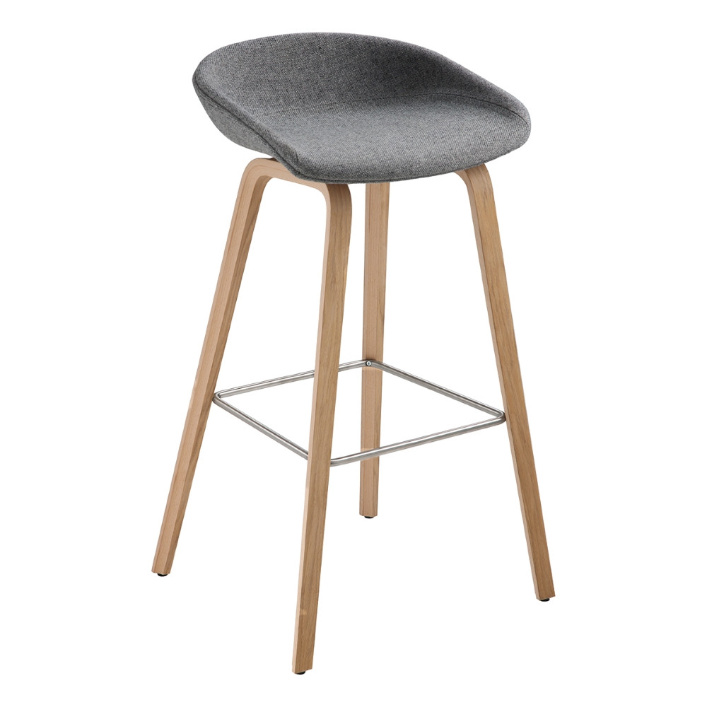 Minimalističen barski stol z izoblikovanim sediščem, oblazinjenim s kakovostno tkanino v sivi barvi. Z rahlo ukrivljenim sedežem in dolgimi, elegantnimi lesenimi nogami ima preprosto, a izrazito vizualno prisotnost, zaradi česar je idealen kot barski stol v različnih poslovnih, javnih in zasebnih kontekstih. Dvodelno podnožje stola je izdelano iz bukovega lesa, v naravni barvni izvedbi. Sedišče je na višini 78 cm. Podnožje stola je povezano s kromiranim naslonom za noge, ki hkrati tudi omogoča dobro stabilnost stola pod obremenitvijo. Maksimalna nosilnost barskega stola je 120 kg.