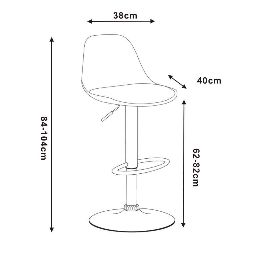 Praktičen barski stol z nastavljivo višino in vrtilno funkcijo, na voljo v povsem črni ali v sivi izvedbi s kromiranim podnožjem. Sedež je narejen iz PP materiala, z oblazinjenjem iz umetnega PU usnja. Višina sedišča se lahko nastavi od od 62 do 82 cm. Podnožje stola je narejeno iz kovine. Črna varijanta ima podnožje mat črne barve, prašno lakirano za boljšo zaščito pred okoljem, siva barva pa ima podnožje s krom finišem. Stol je opremljen tudi z naslonjalom za noge v obliki polmeseca, za bolj udobno sedenje. Maksimalna nosilnost barskega stola je 120 kg.