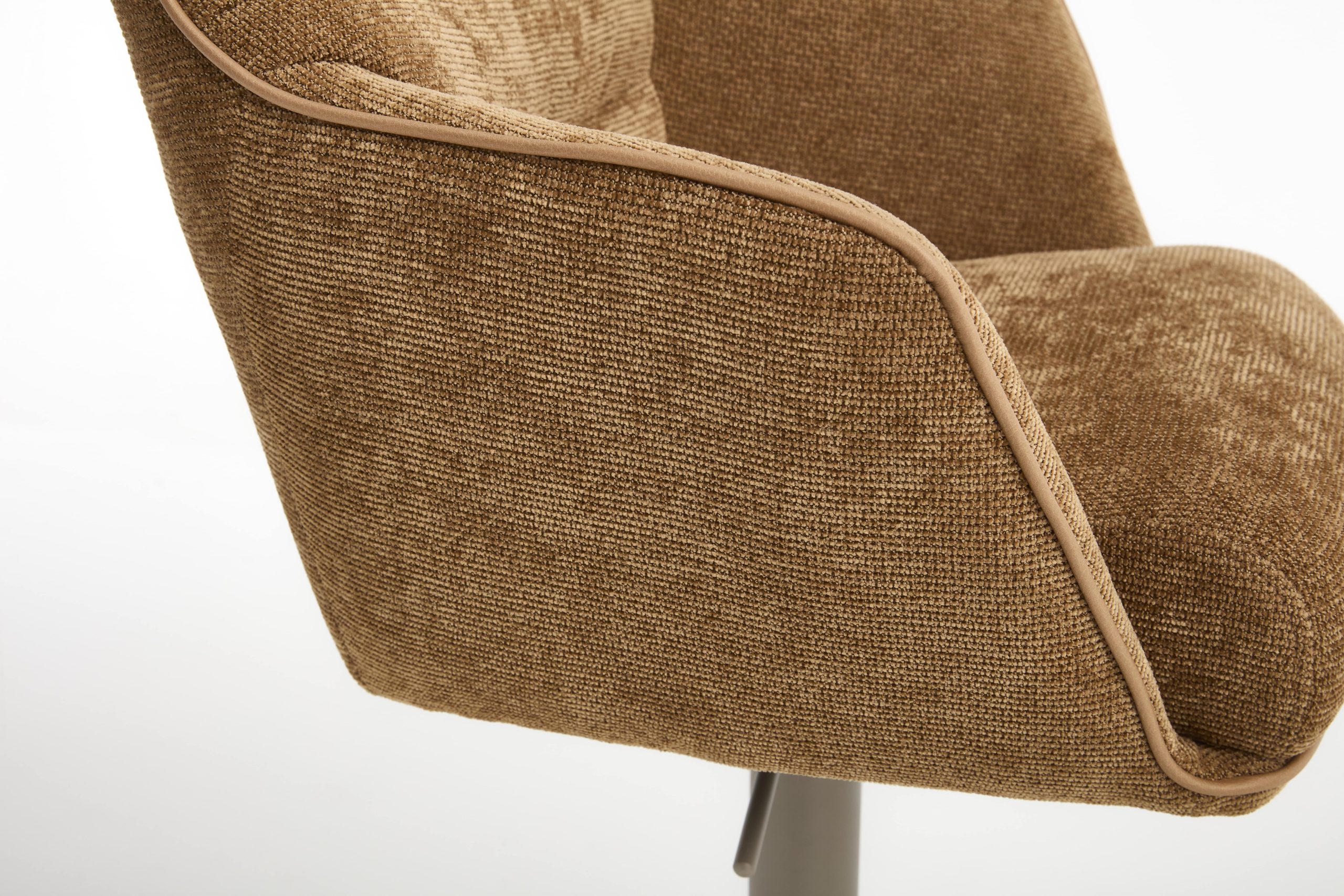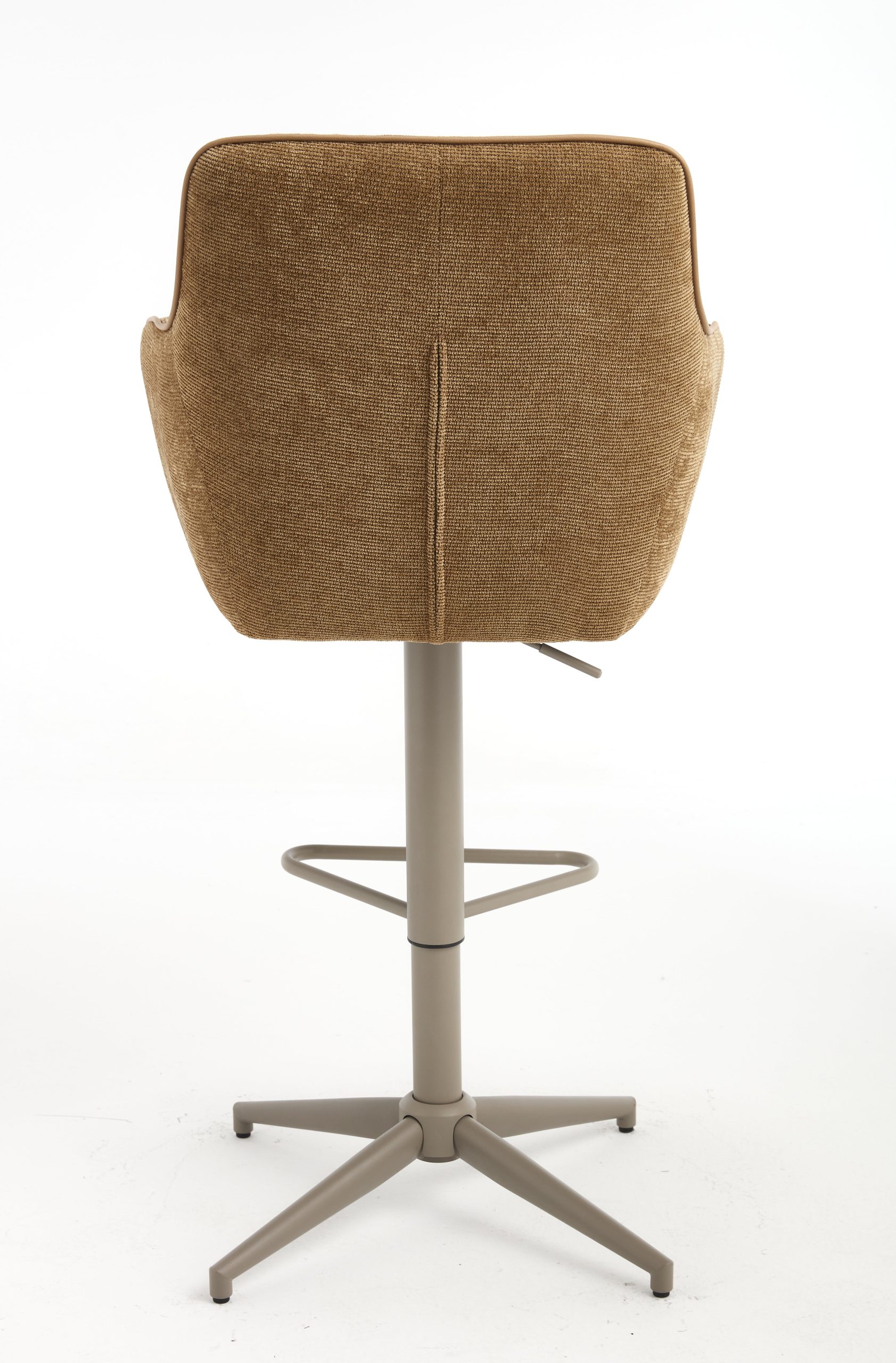Velik in udoben barski stol, v celoti oblazinjen s kakovostno rjavo tkanino. Integrirani nasloni za roke in naslon za hrbet zagotavljajo odlično ergonomsko oporo celotnemu sedečemu telesu. Podrobnosti šivov in obrobe vzdolž robov prispevajo k zanimivemu videzu ki pritegne pogled kljub enobarvni paleti.