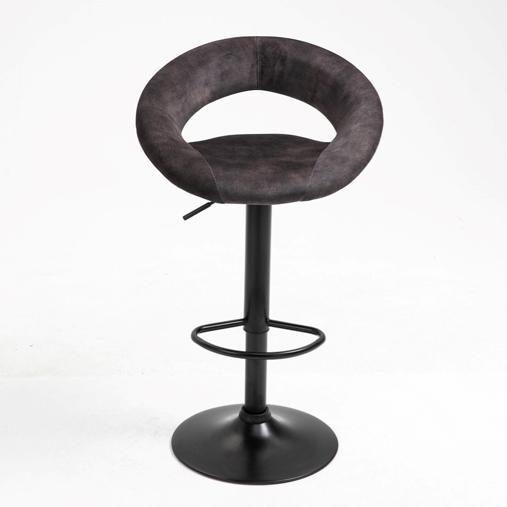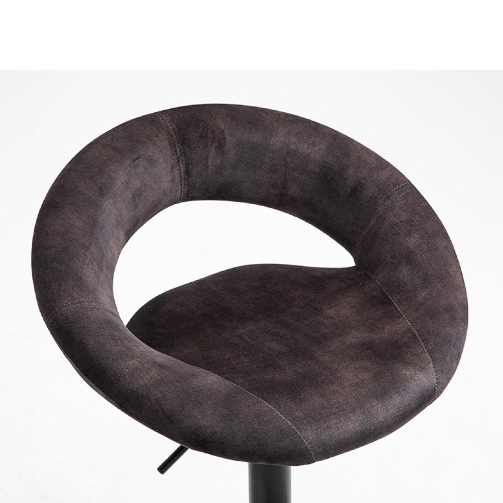 Trendovski barski stol, oblazinjen s kvalitetno tkanino v antracit barvi. Je vrtljiv in nastavljiv po višini. Sedišče je debeline 6 cm, kar vam omogoča udobno sedenje. Notranjost sedišča je sestavljena iz vezanih plošč in pene. Podnožje, debeline 1,2 cm, je kovinsko in prašno lakirano v črno mat barvo. Ima tudi opiralo za noge. Maksimalna nosilnost je 120 kg.