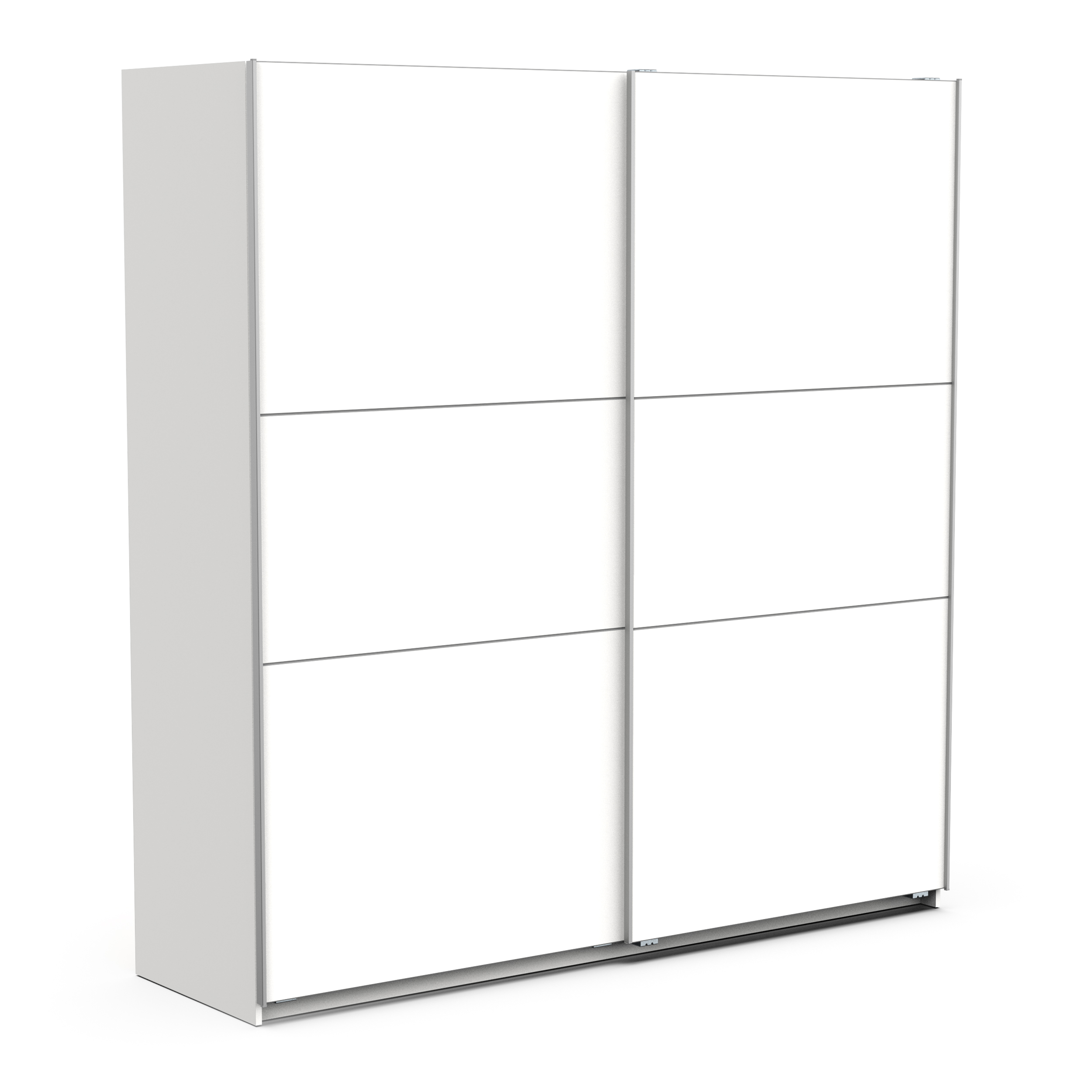 Široka garderobna omara z drsnimi vrati, na voljo v mat beli ali sonoma hrast barvi. Garderobna omara je v celoti izdelana iz visokokakovostnega iverala, oblečenega v melamin, s ploščami debeline 1,2 ter 1,5 cm. Notranjost je navpično razdeljena na dvoje s fiksno pregrado. Garderobna omara je opremljena z dvema robustnima fiksnima policama, vsaka z nosilnostjo do 15 kg za vaša zložena oblačila, dvema obešalnima letvicama, vsaka z nosilnostjo do 24 kg za obešanje oblačil ter robustno vrhnjo ploščo z največjo obremenitvijo do 43 kg za večje predmete.  Celotna garderobna omara je izdelana v Franciji. Z omaro lahko dokupite tudi dodaten set notranjih polic. Dodatne police lahko prav tako nosijo do 15 kg in so v sivi barvi ki se ujema z notranjostjo omare. Oglejte si tudi več drugih, manjših garderobnih omar iz istoimenske kolekcije.