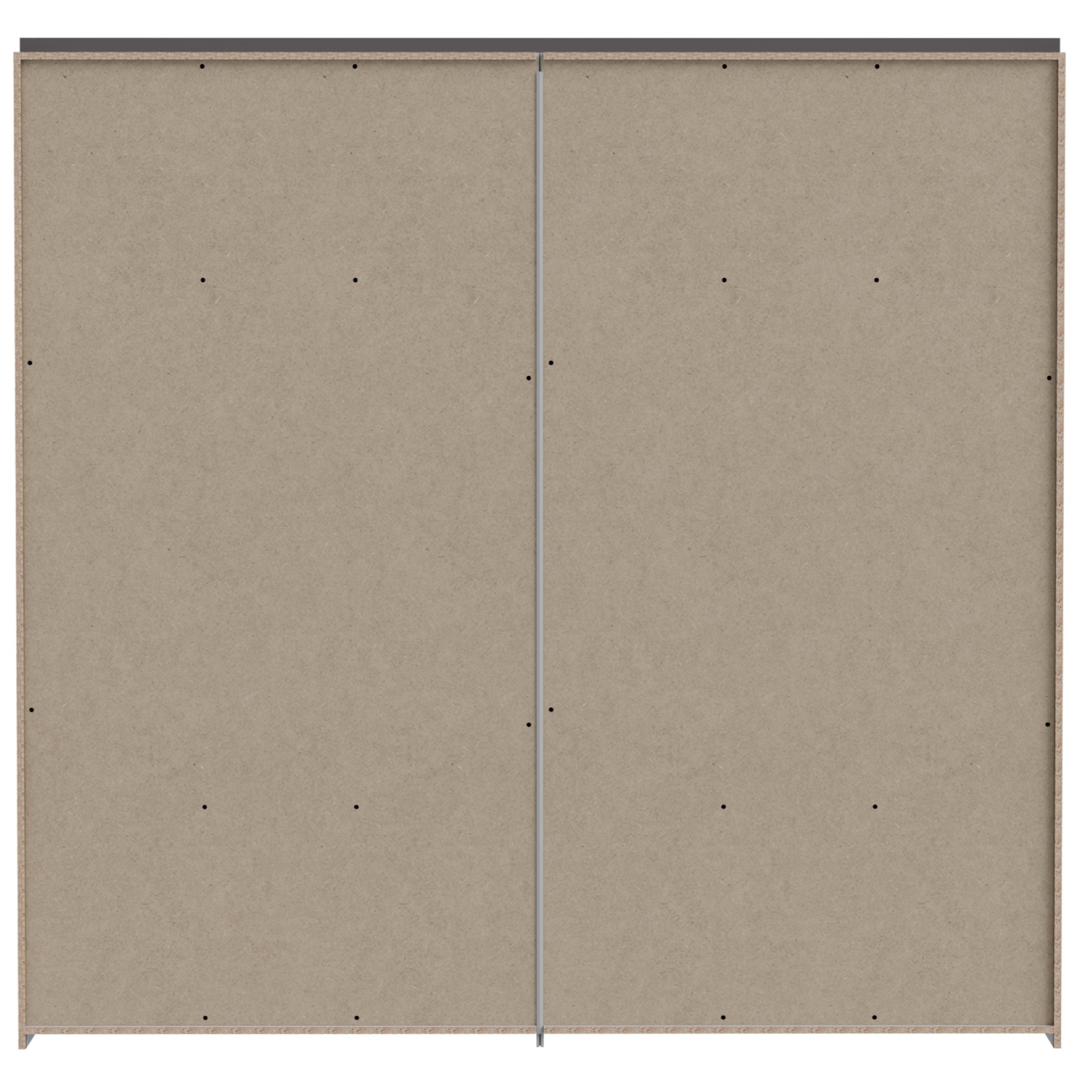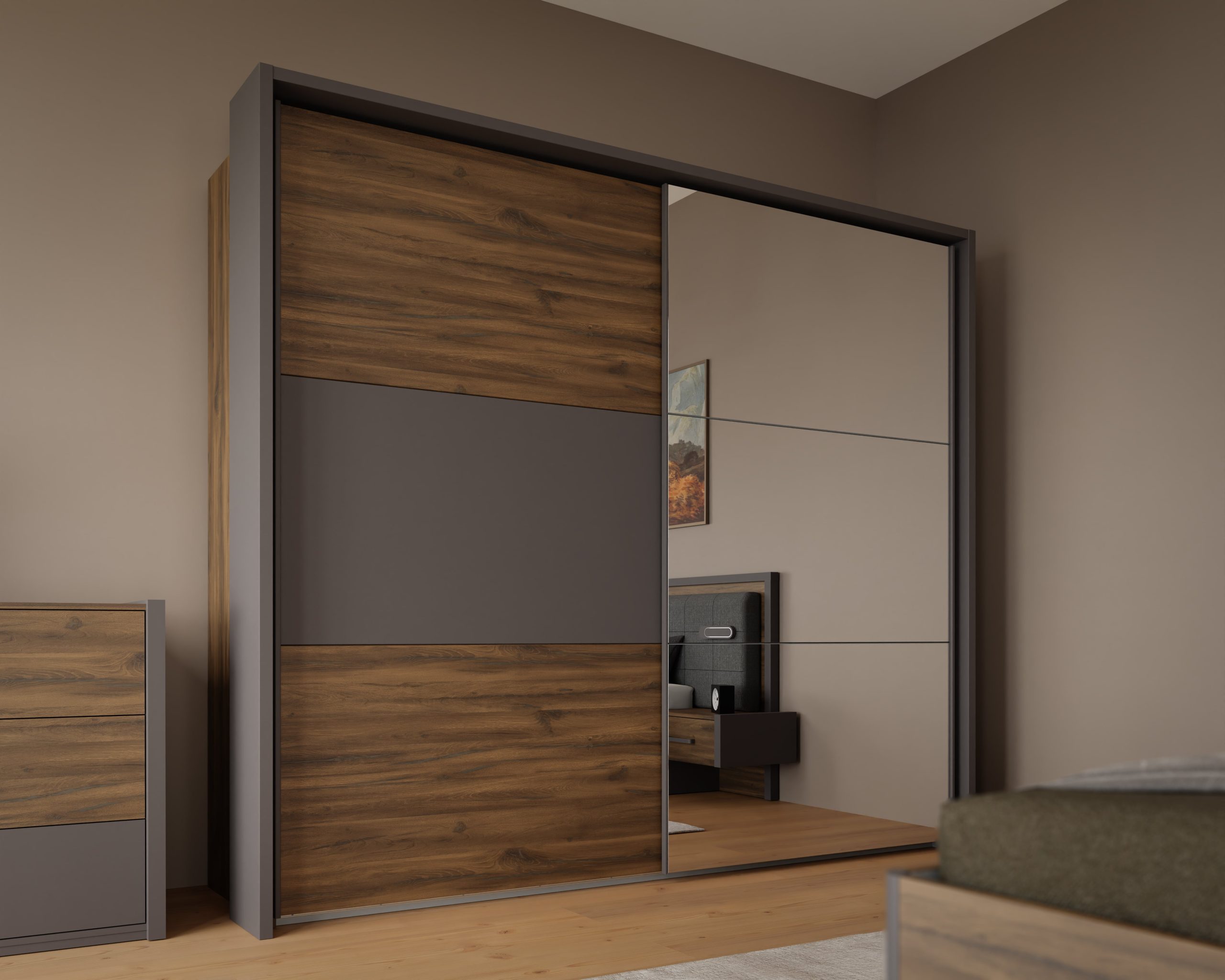 Garderobna omara z drsnimi vrati ter tridelnim ogledalom, na voljo v kombinaciji temnega hrasta in sive barve. Garderobna omara je razdeljena na dva oddelka z vertikalno pregrado.