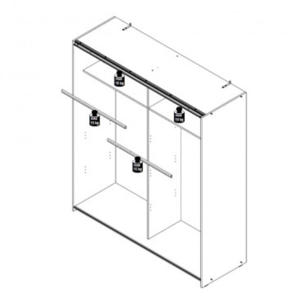 Garderobna omara z dvojimi drsnimi vratci ima eno vratno krilo v beli barvi, na drugem je ogledalo. Pozicija vrat je zamenljiva. Kovinski deli so aluminijasti. V notranjosti se nahajata dve odstranljivi obešalni letvi, nad njima sta polici. Maksimalna nosilnost letev je 15 kg, polic 10 kg. Dodatno je možno naročiti tudi set treh notranjih polic.