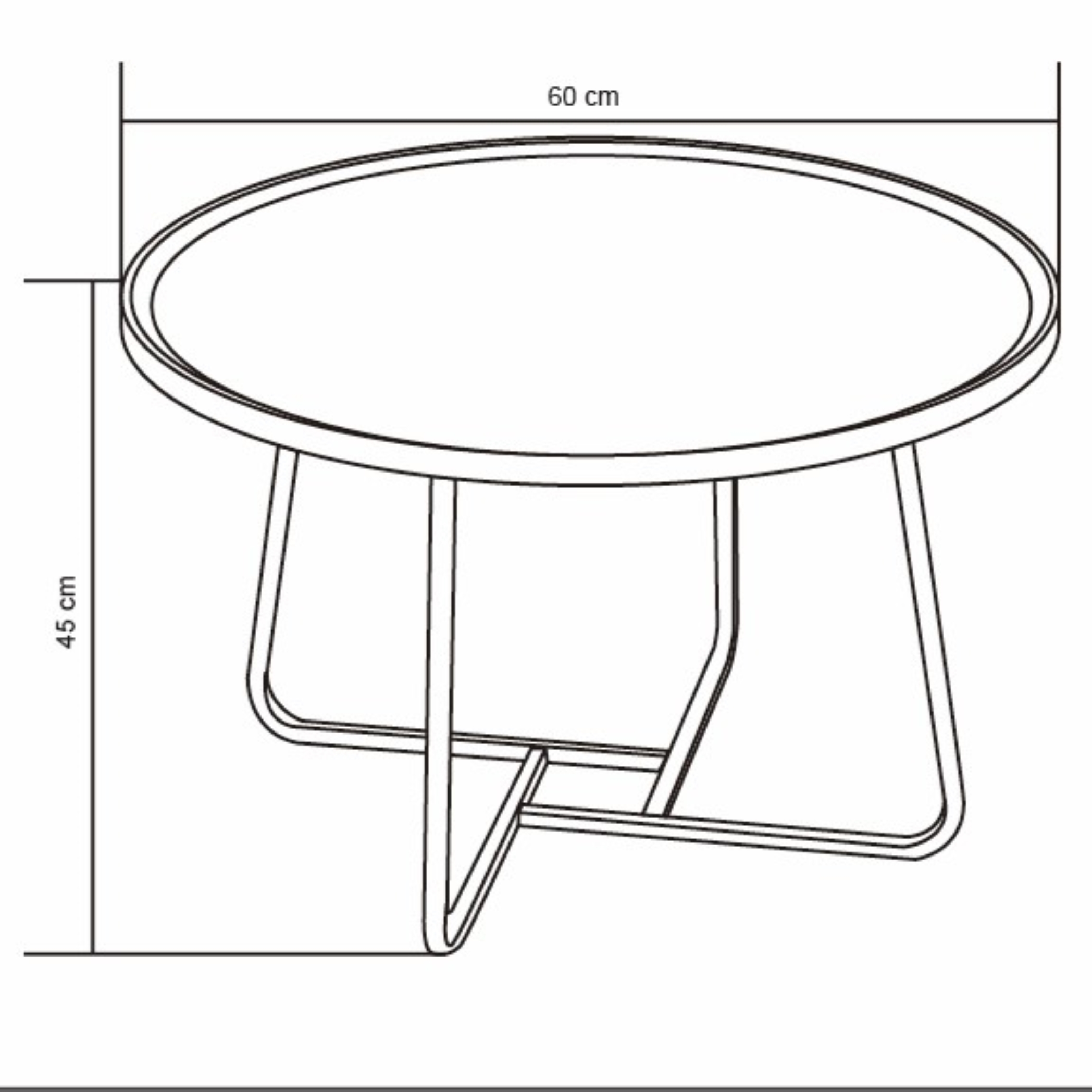 Okrogla klubska miza, na voljo v temno rjavi barvi. Mizna plošča ima premer 60 cm in je narejena iz MDF-ja, oblečenega v papir. Rahlo privzdignjeni robovi mizne plošče dodajo preprečujejo, da bi predmeti zdrsnili z nje. Podnožje mize z geometrijsko strukturo je izdelano iz kovinskih cevi, velikosti 15×1 mm, in prašno lakiranih s črno barvo za zaščito pred okoljem in obrabo.