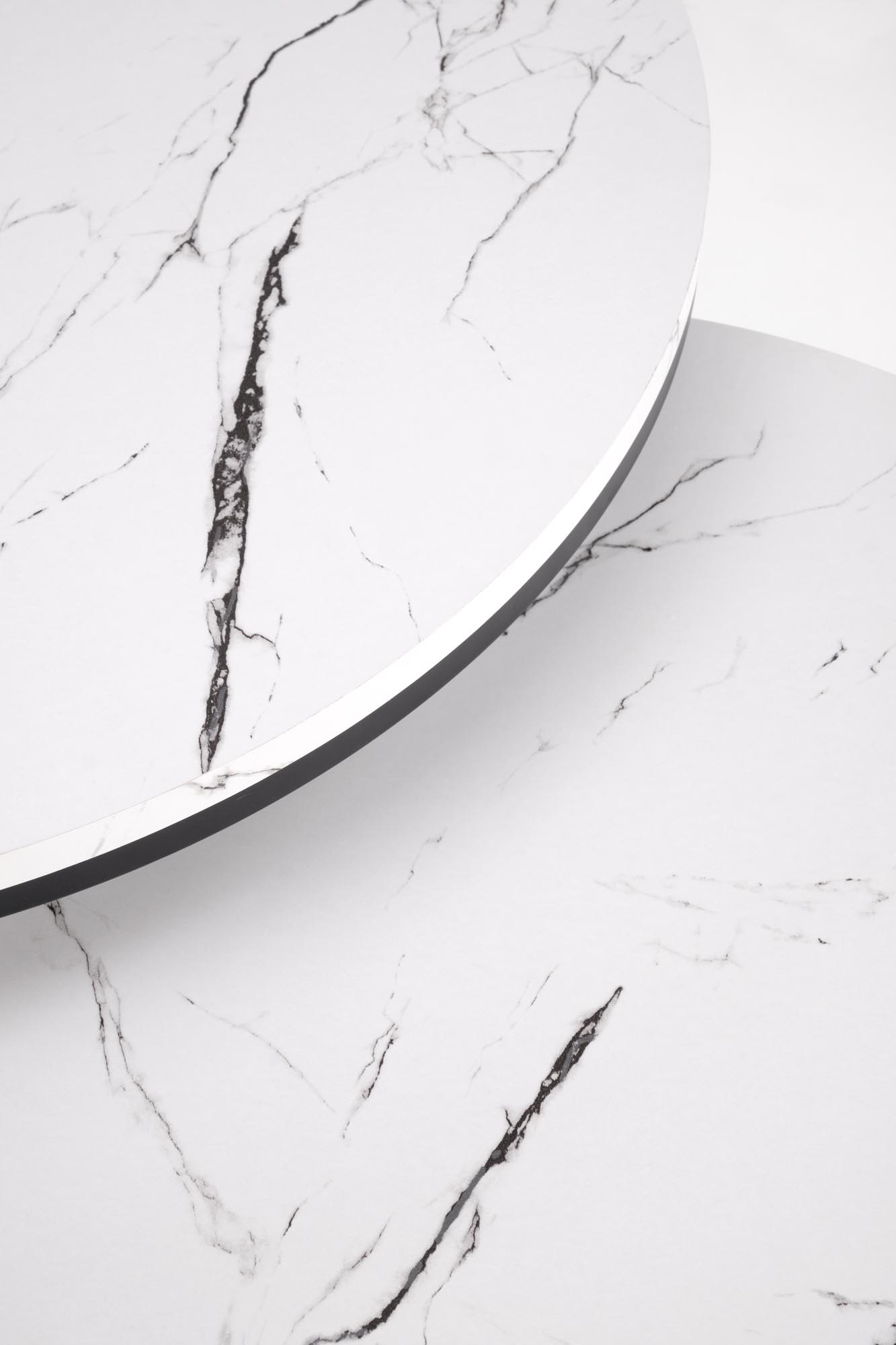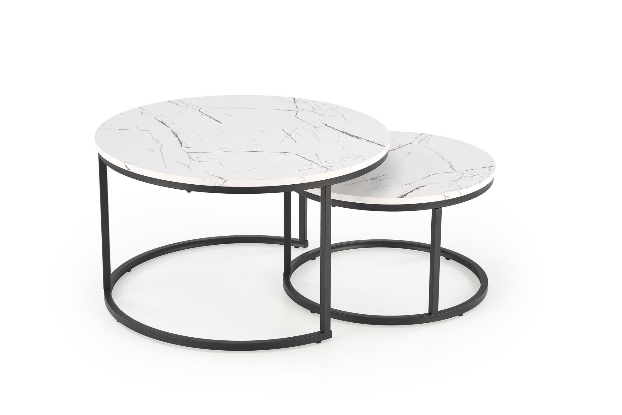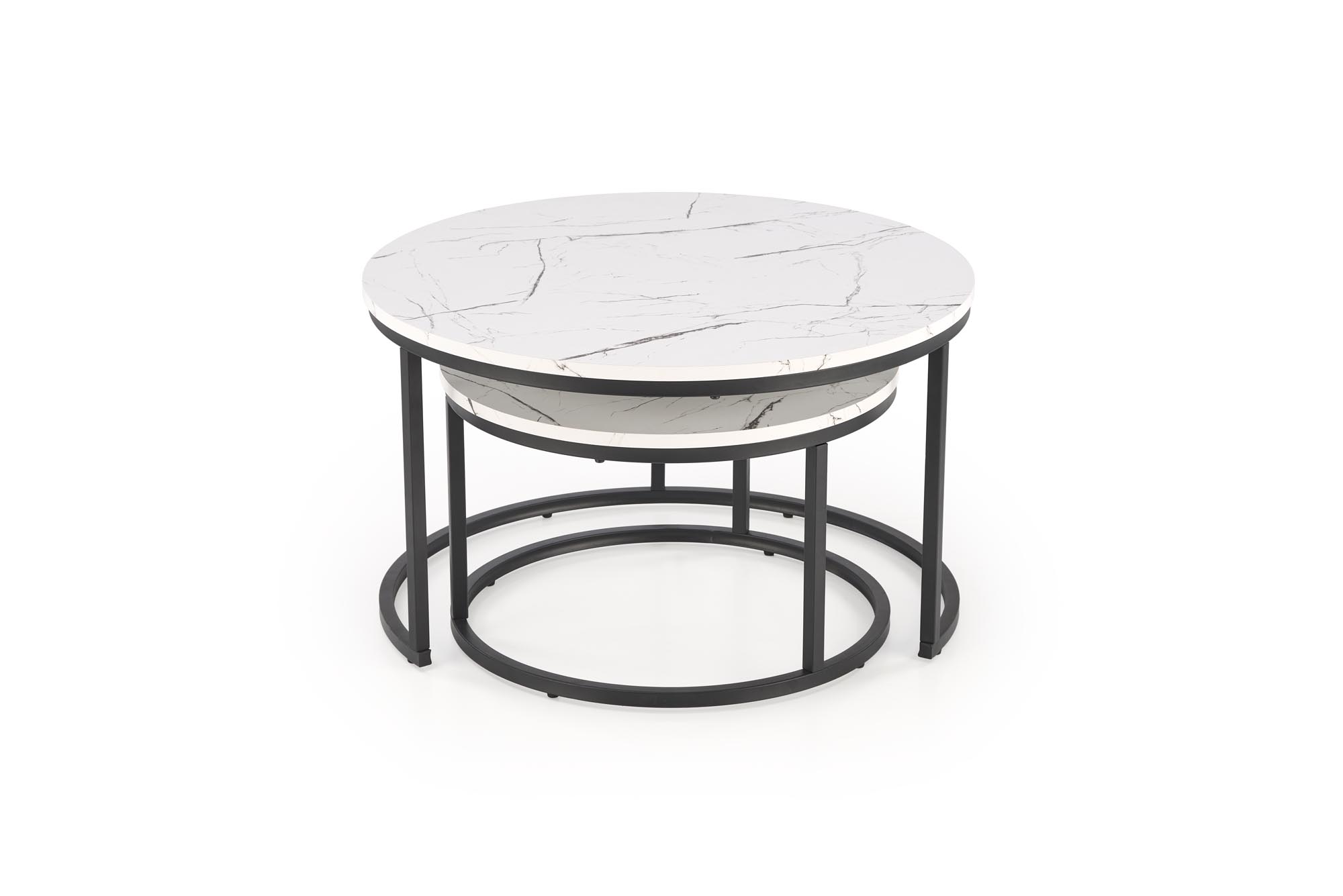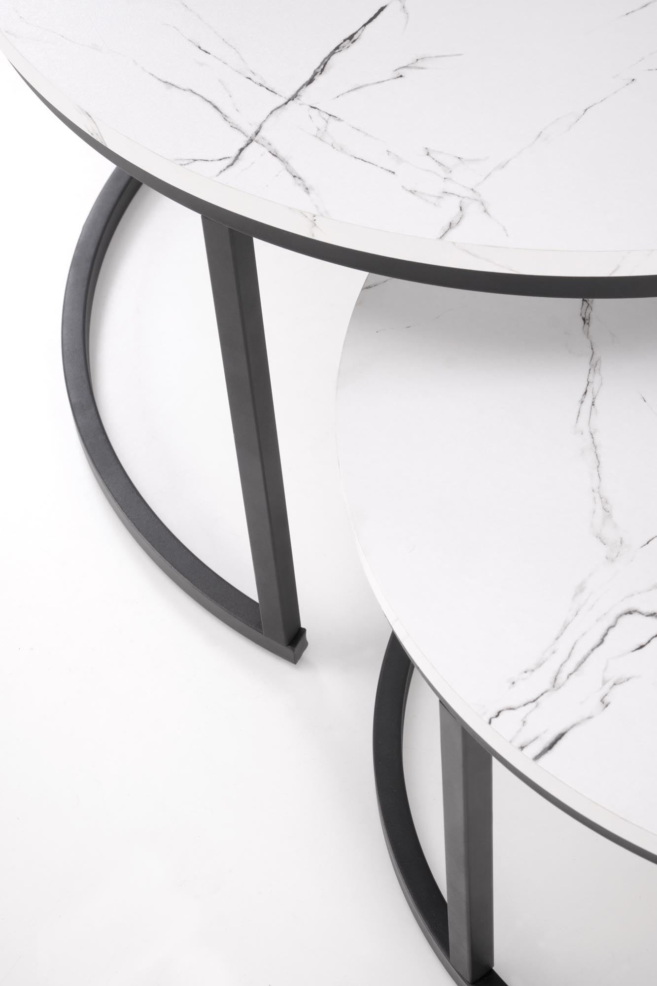 Dodajte svojemu dnevnemu prostoru pridih elegance s sodobnim kompletom dveh okroglih klubskih mizic. Mizna plošča v videzu marmorja ustvarja prestižen in brezčasen videz. Stabilno kovinsko ogrodje v črni barvi pa doda moderen industrijski pridih in zagotavlja dolgo življenjsko dobo. Mizico manjše dimenzije lahko preprosto pospravite pod večjo, kar omogoča prilagodljivo uporabo prostora – idealno za manjše dnevne prostore.
