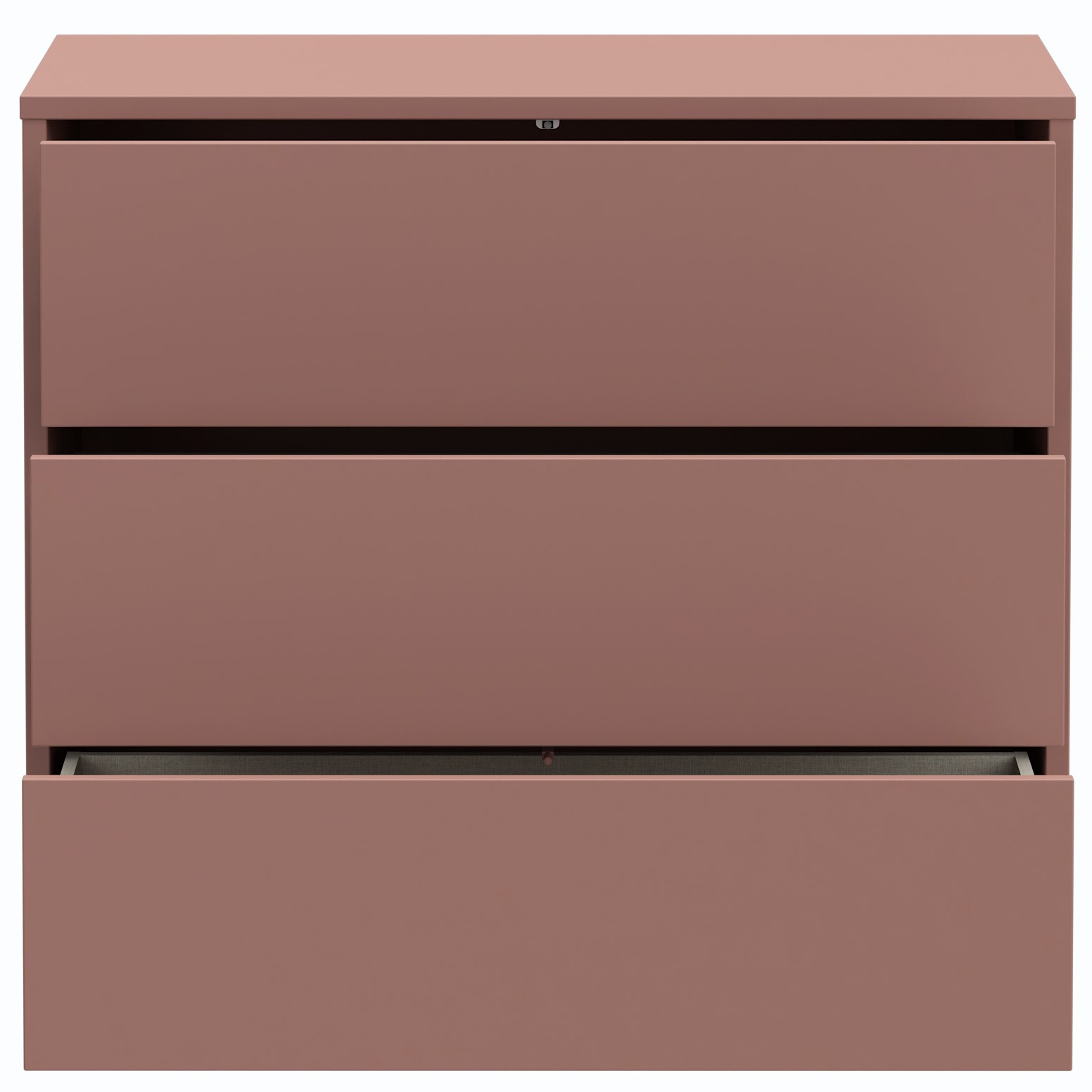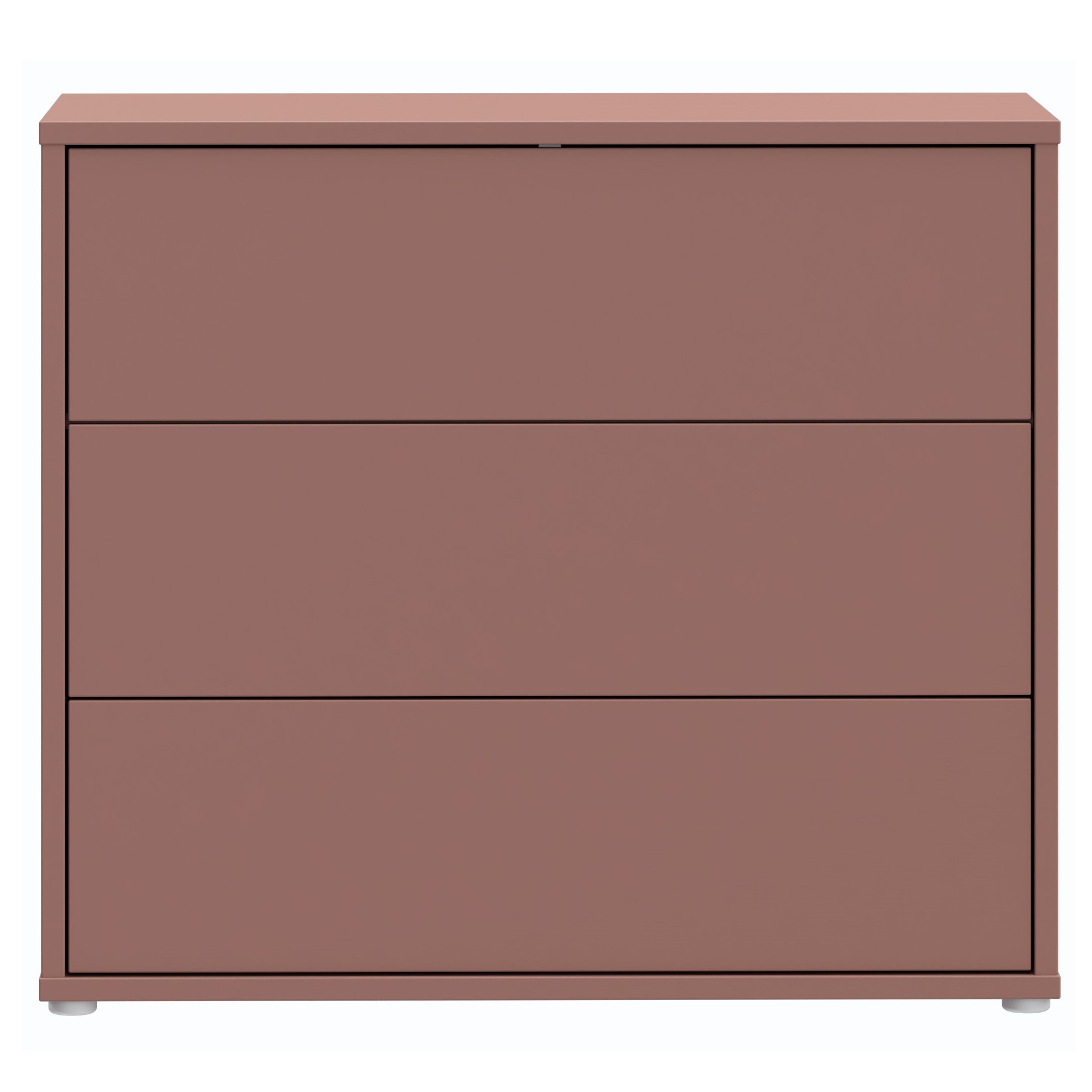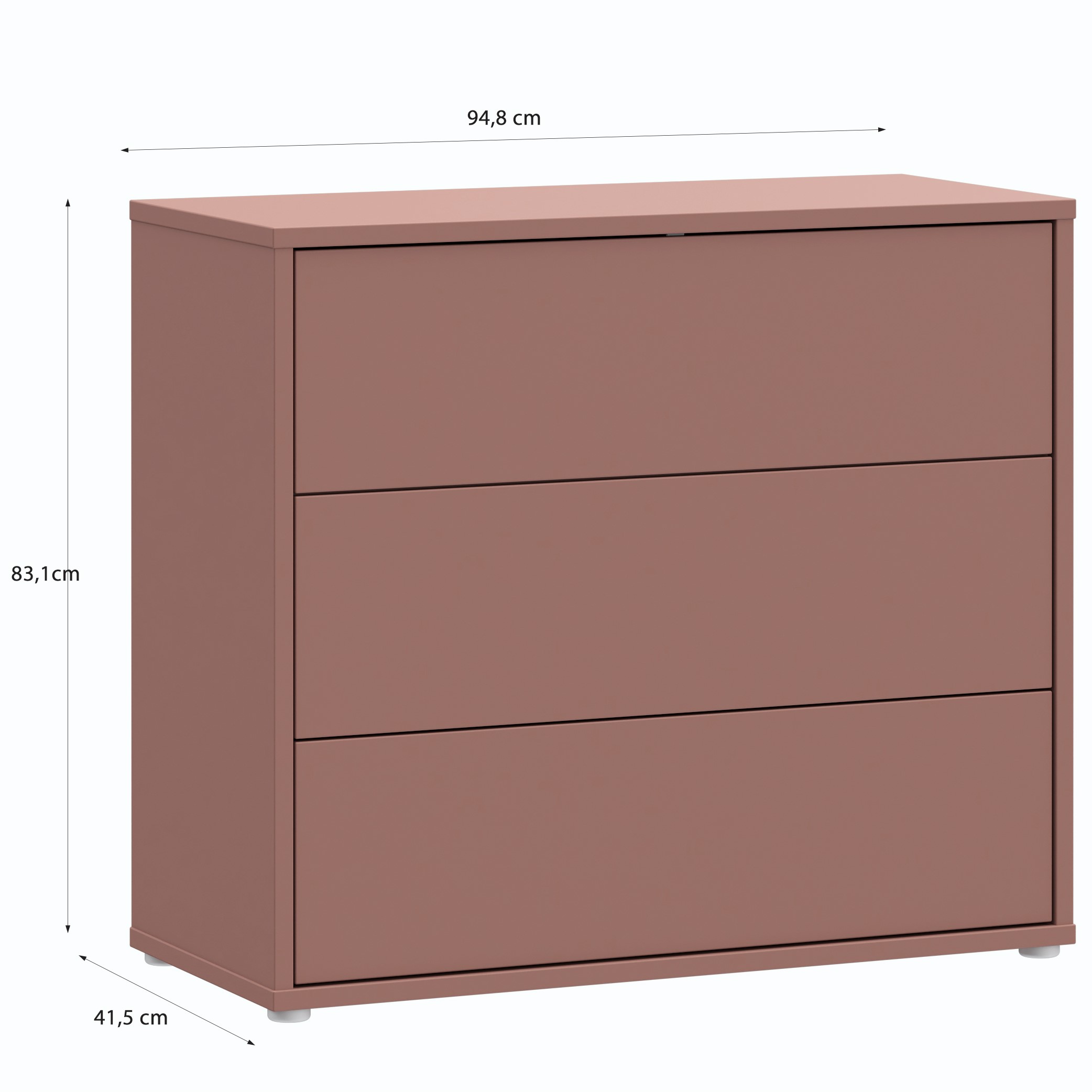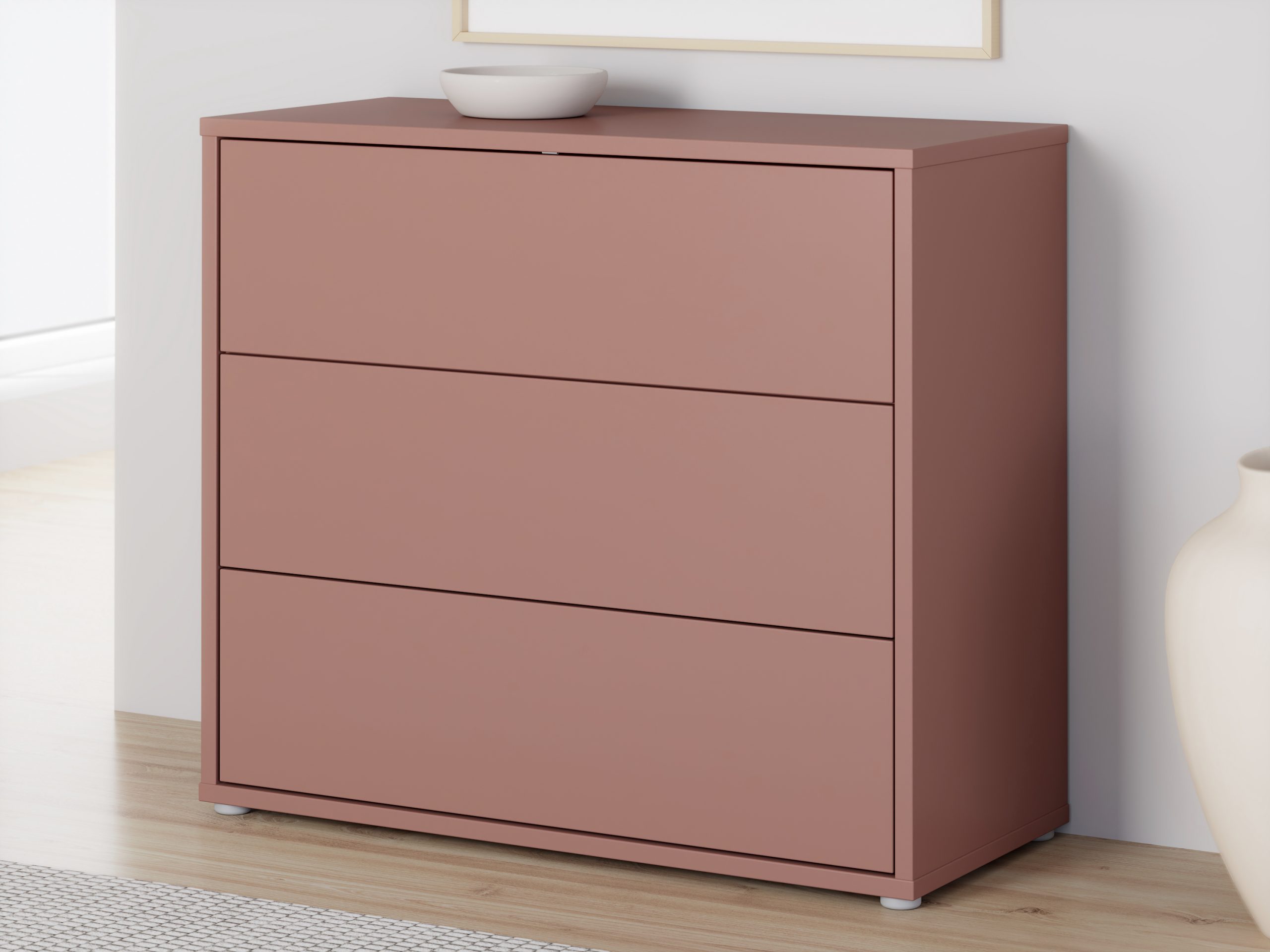 Praktična komoda v barvi terakote, s tremi širokimi predali ter minimalističnim dizajnom, ki nudi pokrit prostor za shranjevanje vaših stvari, naj bo to v dnevni sobi, pisarni ali hodniku.