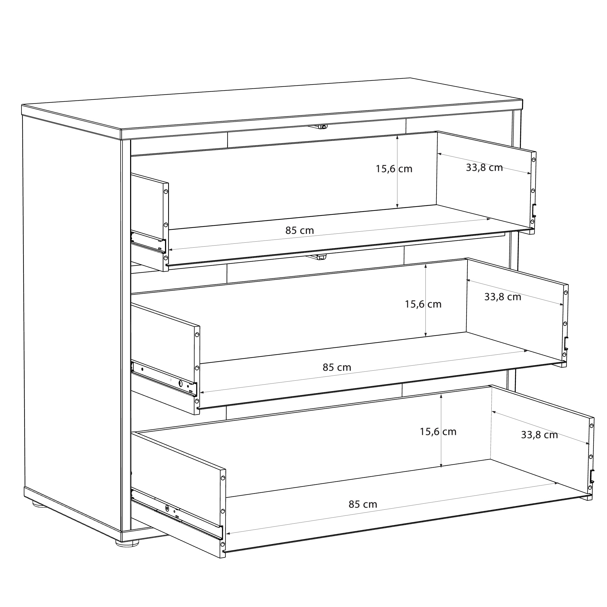 Komoda je v celoti izdelana iz kakovostnega iverala, prevlečenega z melaminom za dobro odpornost ter obenem enostavno čiščenje in vzdrževanje. Podnožje dvigne predalnik na štirih nožicah za večjo oddaljenost od tal. Maksimalna nosilnost zgornje plošče je 20 kg.