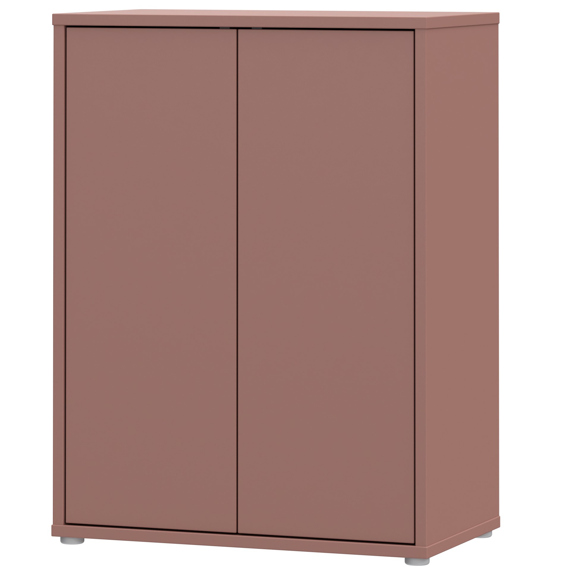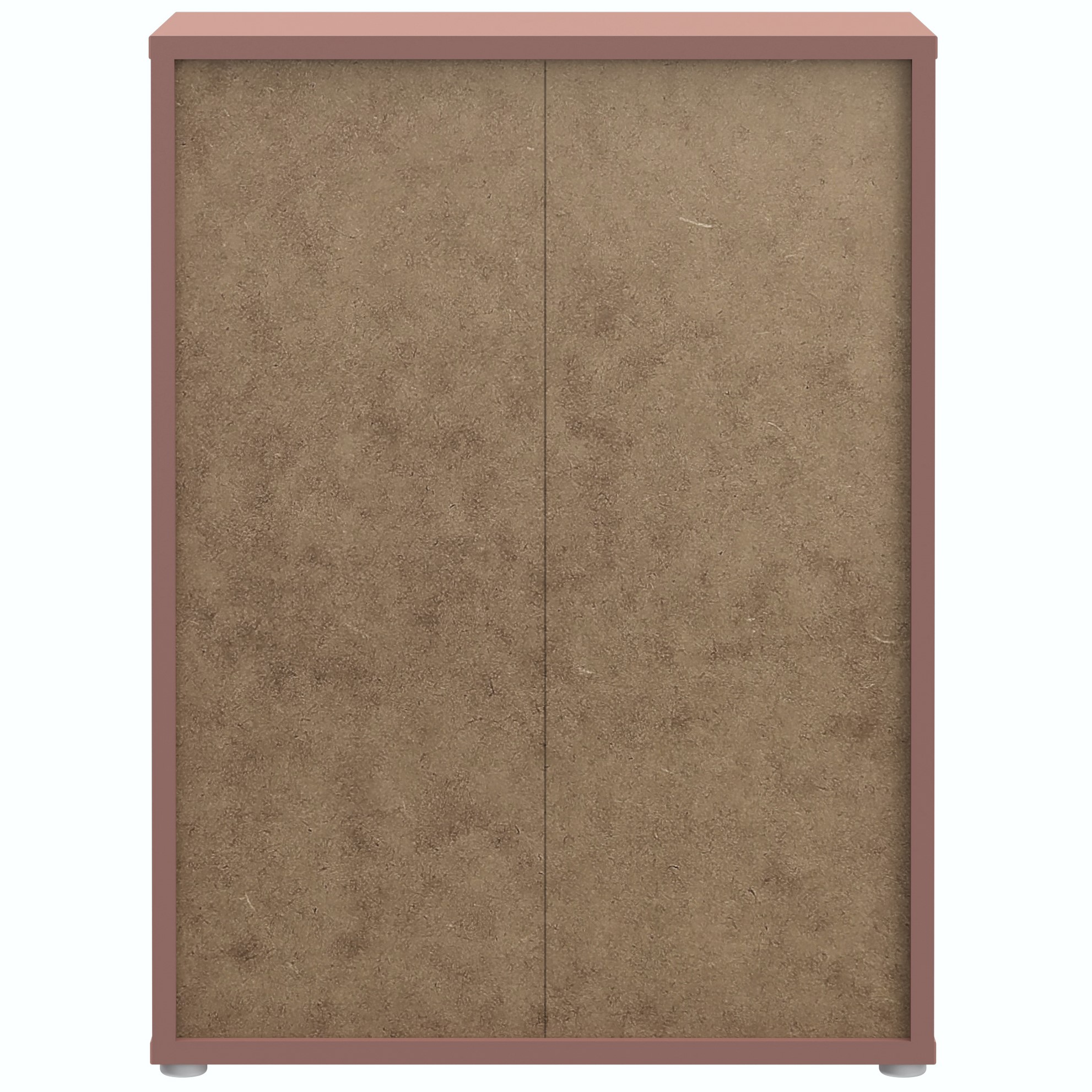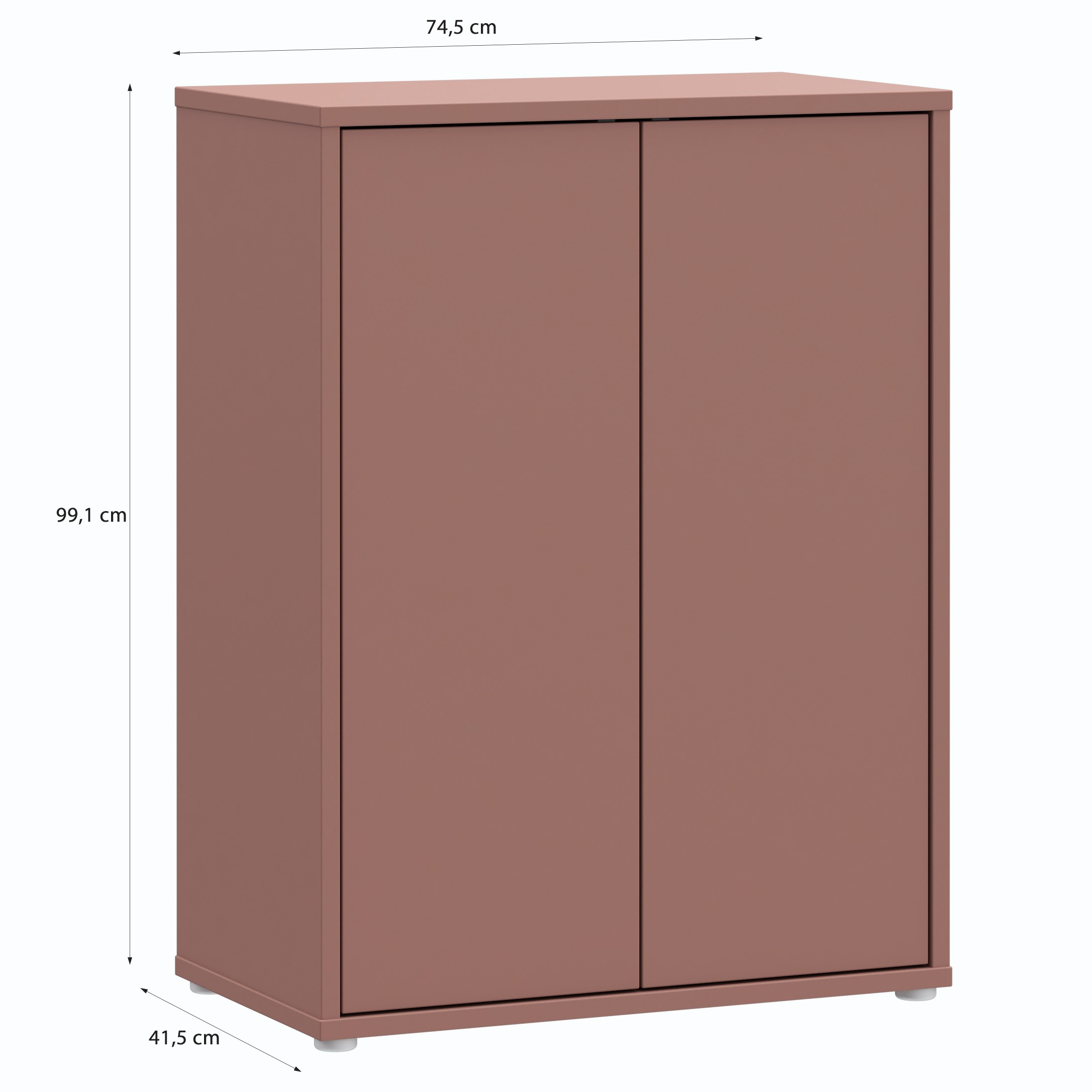 Preprosta komoda z dvema notranjima policama ter dvemi vrati, na voljo v terakoti barvi.