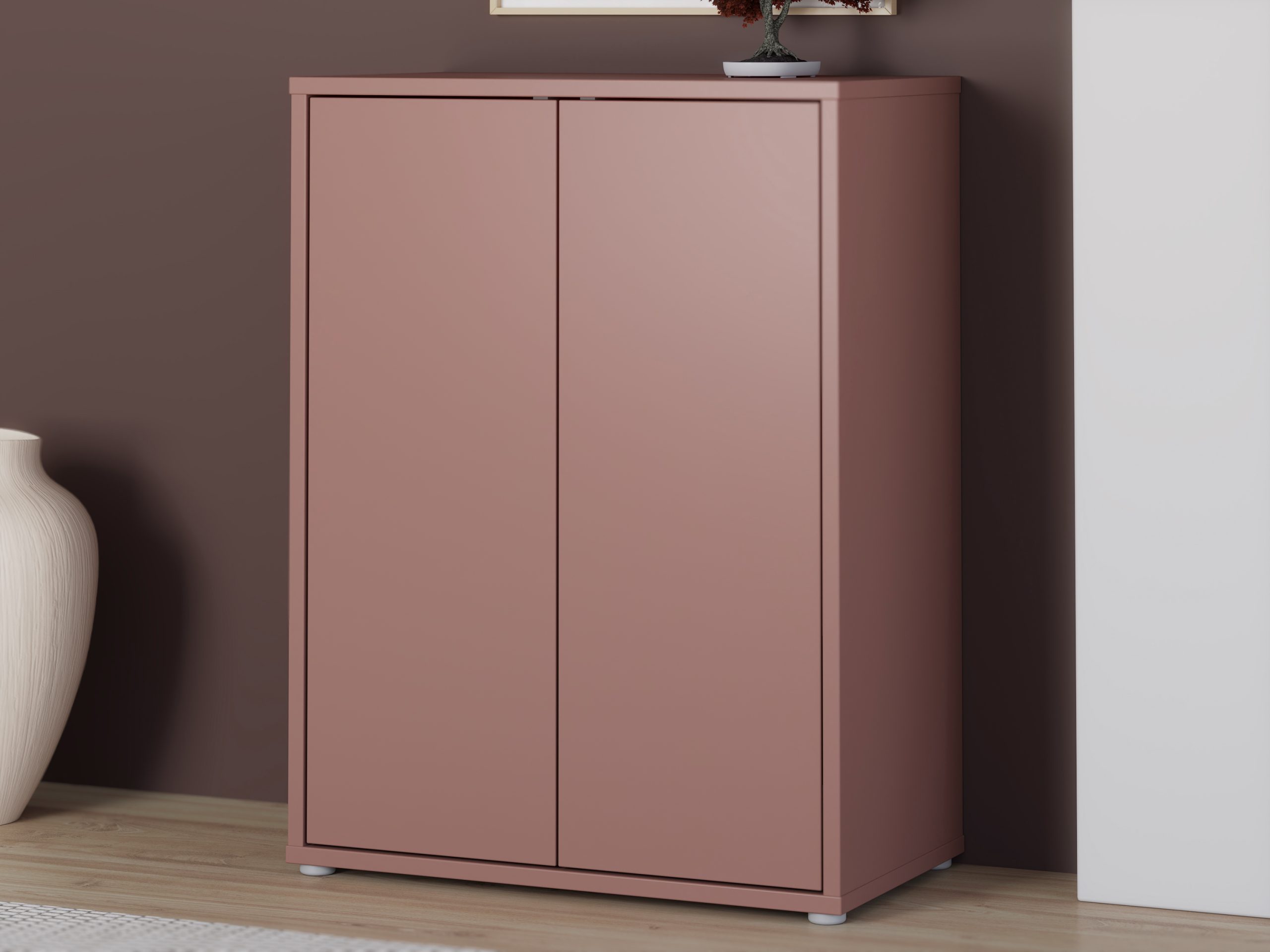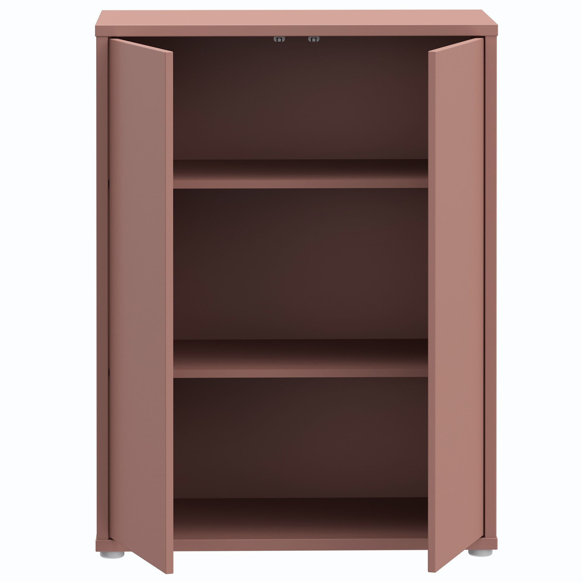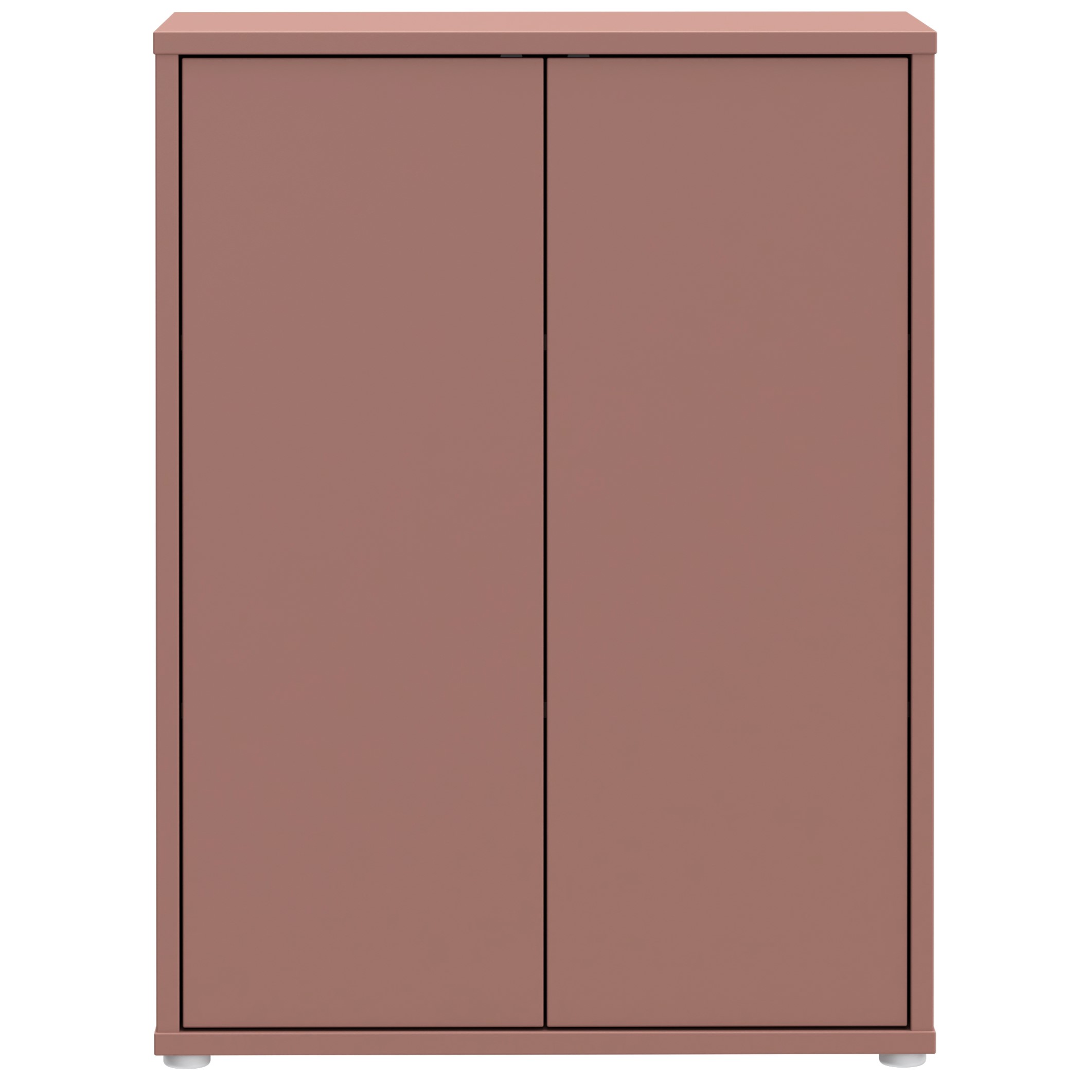 Preprosta komoda z dvema notranjima policama ter dvemi vrati, na voljo v terakoti barvi.