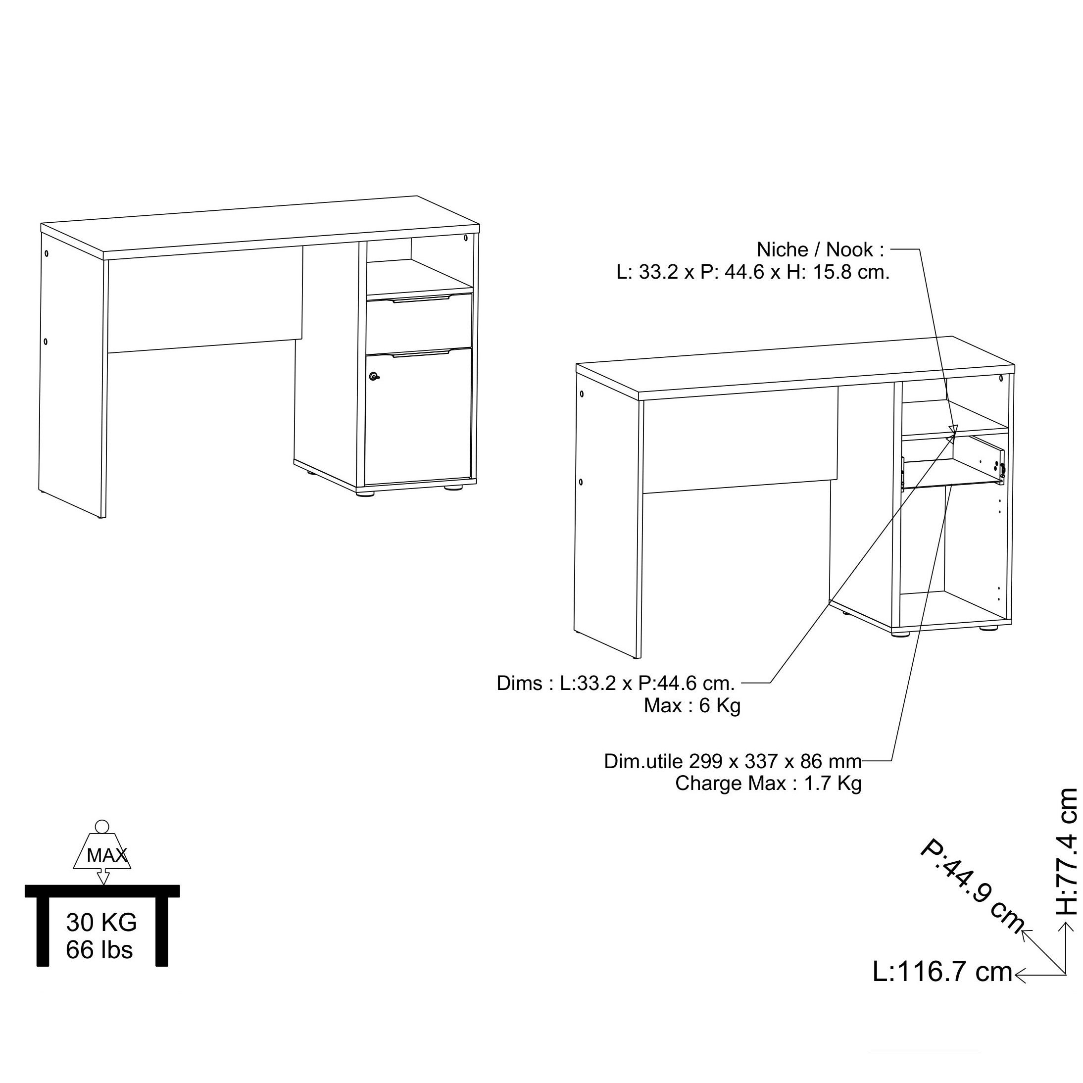 Praktična pisalna miza, v kombinaciji bele in rjave barve, izdelana v Franciji. Narejena je iz kakovostnega iverala, oblečenega v melamin. Na desni strani ima odprt prostor za odlaganje papirjev, en predal ter en kabinet s ključavnico.