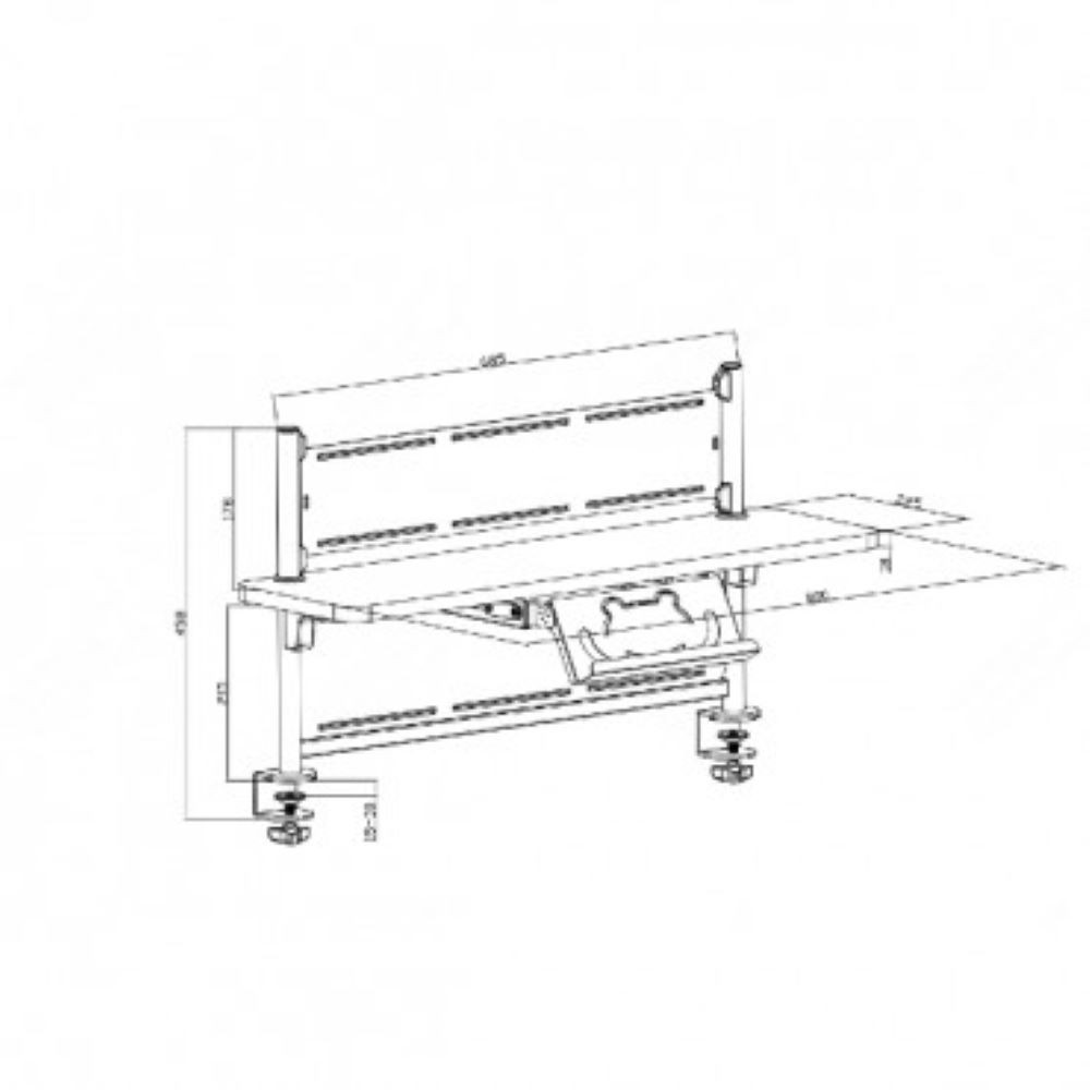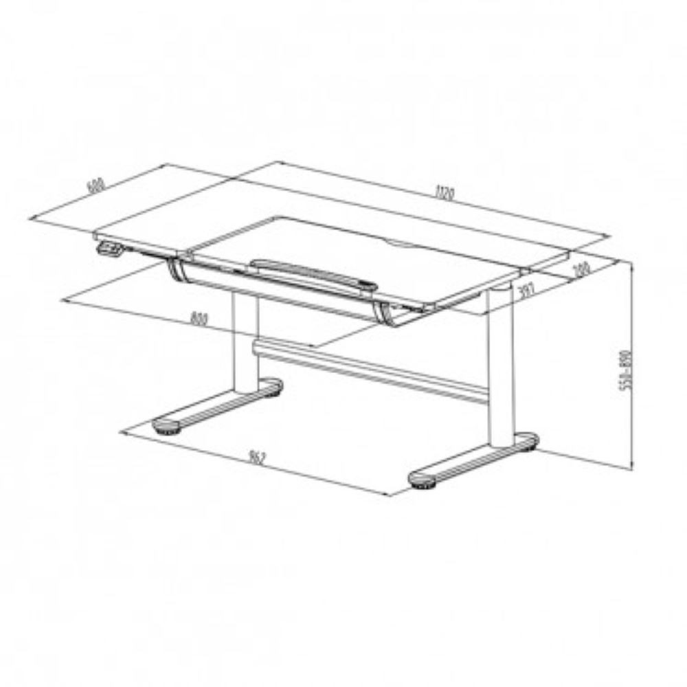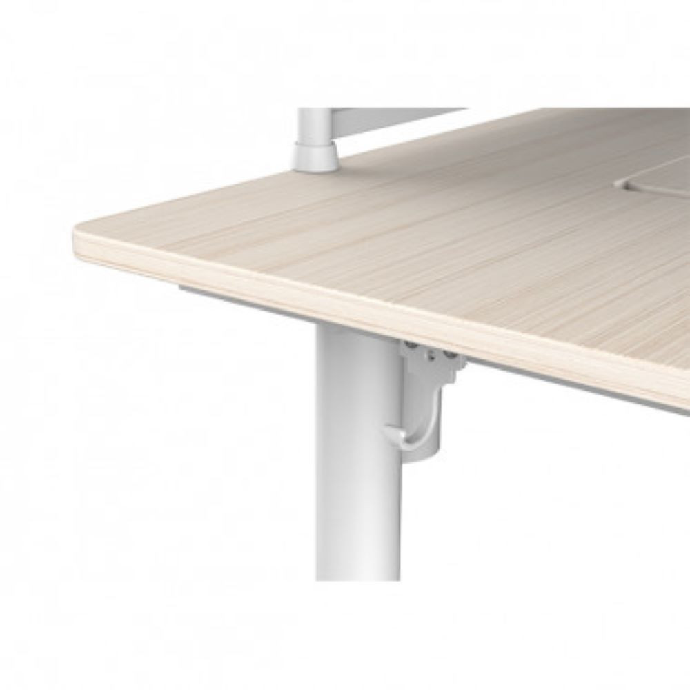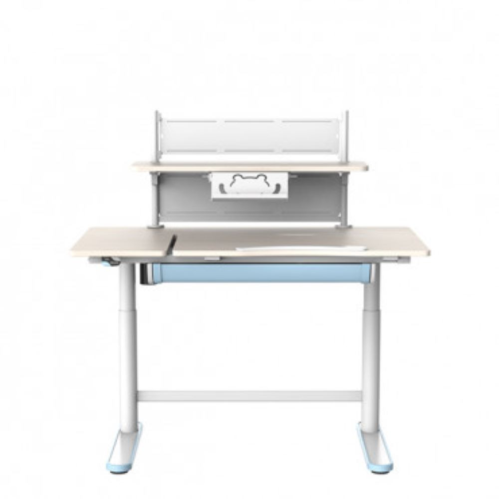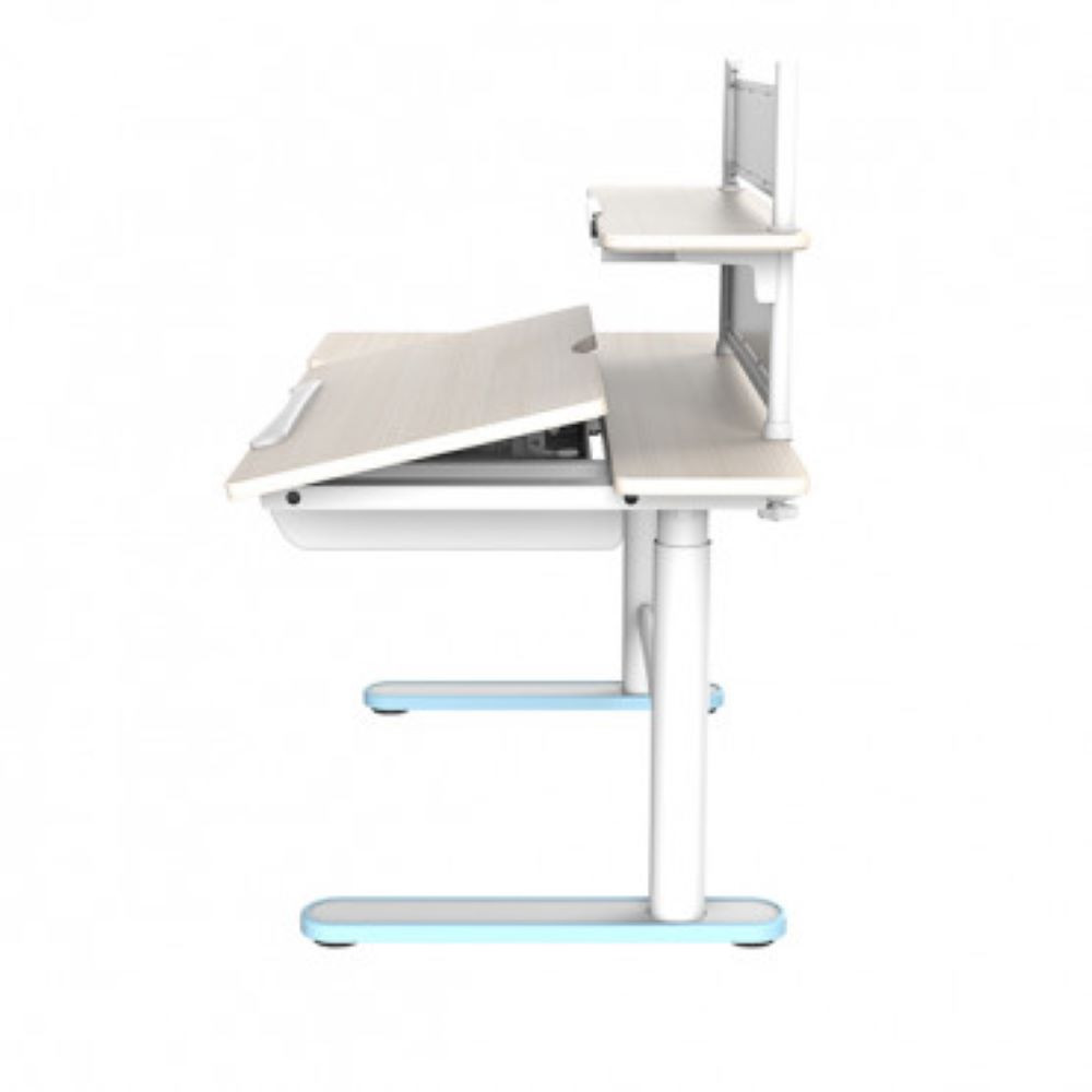 Sodobna pisalna miza bele, rjave in modre barve z avtomatsko nastavljivo višino, diagonalno nastavljivim namizjem in predalom za shranjevanje. Ima vgrajen električni motor, ki omogoča gladko spreminjanje višine mize samo s pritiskom na gumb. Premični mehanizem ima razpon 34 cm, kar omogoča, da se lahko namizje iz najnižjega položaja pri 55 cm dvigne na najvišji položaj na višini 89 cm in katerokoli višino med njima. Dodatna polica in nosilec za knjige sta visoka dodatnih 41,1 cm. Hitrost dviganja neobremenjene mize je 15 mm na sekundo. Deluje pri napetosti med 100 do 240V. Miza je opremljena s kljuko za torbe. Namizje se lahko nastavi pod kotom od 0° do 40°. Miza je opremljena s polico in nosilcem za knjige. Maksimalna obremenitev je 40 kilogramov.