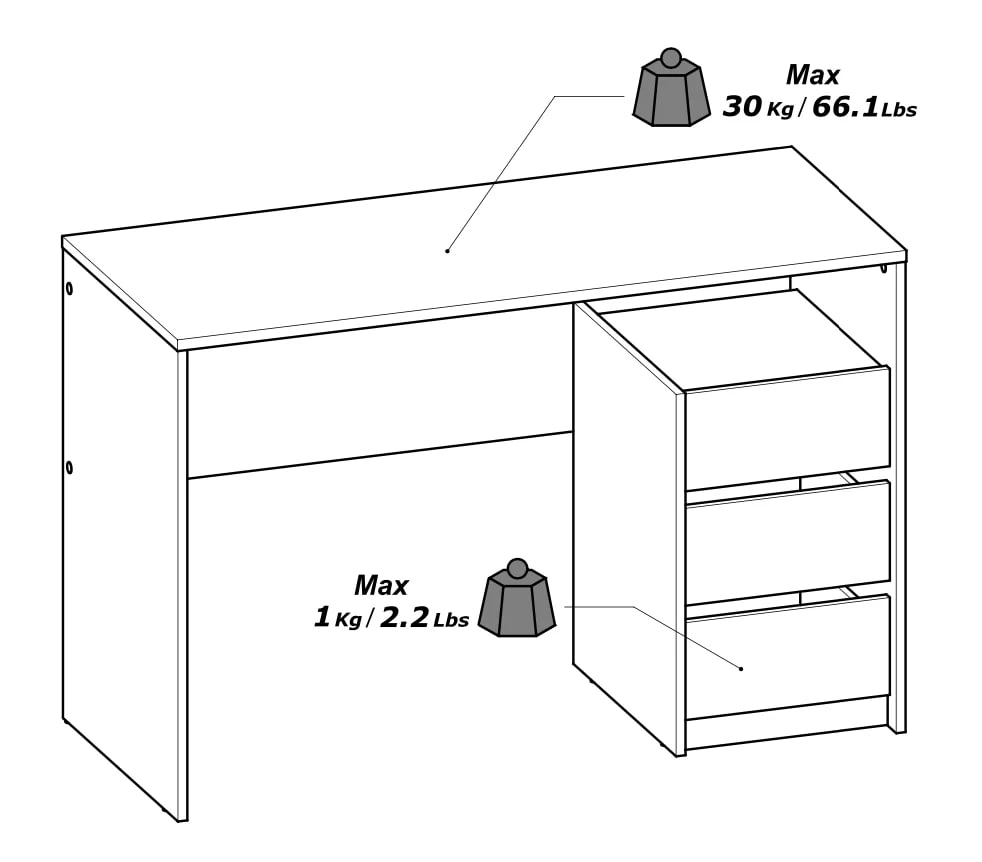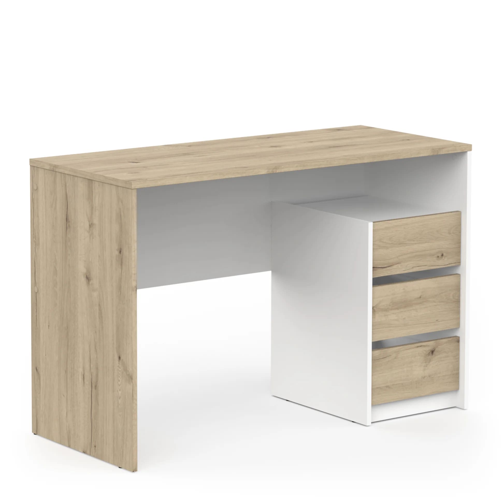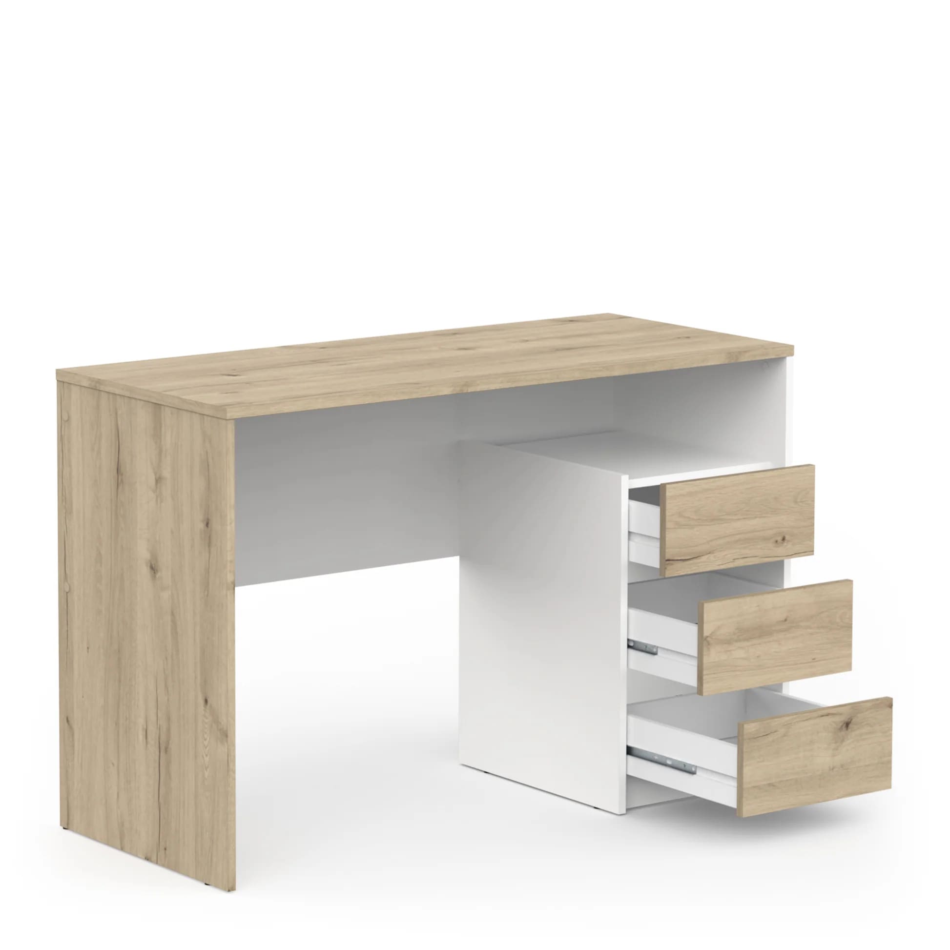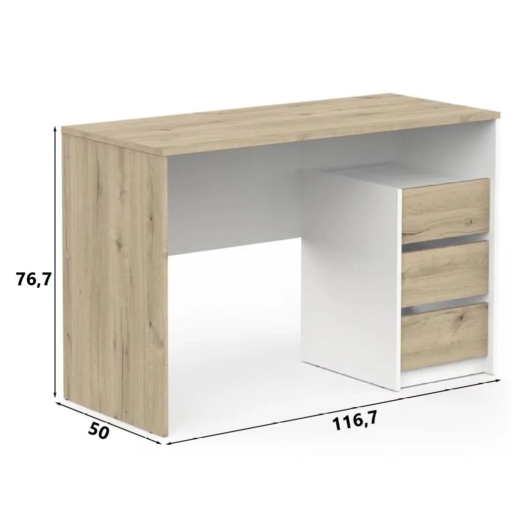 Ta praktična pisalna miza je v celoti izdelana v Franciji in bo popoln dodatek k vsaki domači pisarni, študiju ali delovnemu prostoru. Miza je na voljo v mehki, privlačni kombinaciji imitacije hrasta in bele barve, s dodobnim, in hkrati tudi naravnim pridihom, ki se dobro zlije z različnimi stili. Izdelana je iz visokokakovostnih ivernih plošč, prevlečenih z melaminom. Melaminska prevleka ne ščiti le površine pred praskami, madeži in vlago, ampak tudi olajša čiščenje. Pisalna miza ima prostorno delovno površino, ki nudi dovolj prostora za prenosni računalnik, zvezke in druge bistvene delovne stvari. Z nosilnostjo 30 kg je mizna plošča dovolj močna, da podpira večino pisarniške opreme in da imate vse, kar potrebujete, na dosegu roke. Pod mizno ploščo se na eni strani mize nahajajo trije predali brez ročajev, vsak dimenzij 30×33,7×8,6 cm. Ti predali so kot nalašč za lepo pospravljene predmete, ki jih pogosto uporabljate, hkrati pa ohranjajo enostaven dostop. Vsak predal ima nosilnost do 1 kg za manjše predmete, kot so pisalne potrebščine ali zvezki. Med mizno ploščo in predali je še odprt prostor, namenjen odlaganju začanemu odlaganju manjših stvari kot so papirji, registratorji itd. Zaradi čistih linij, naravne barvne sheme in priročnih možnosti za hrambo tsvari je ta miza ekonomična in vsestranska rešitev za vsakogar, ki želi ustvariti urejen in učinkovit delovni prostor.