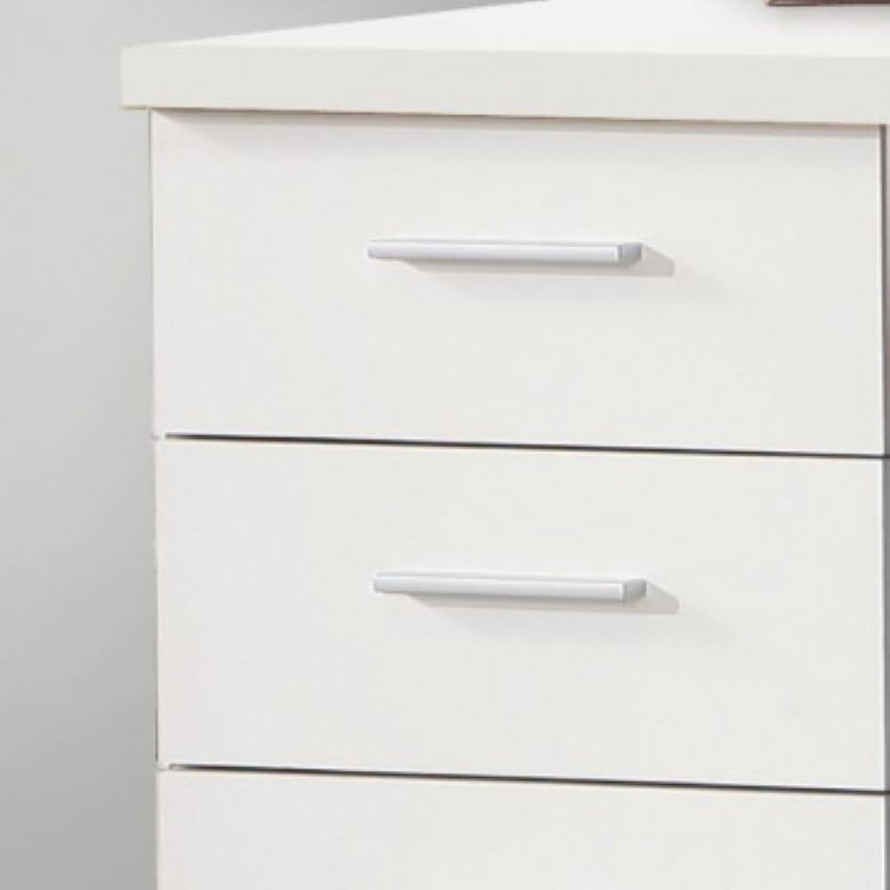 Klasično zasnovana pisalna miza v beli mat barvi ima stransko polno nogo in dodatno ojačitvitev na zadnji strani. Pisalna miza ima 4 predale, ki zagotavljajo veliko shrambne površine. Predali imajo ročaje. Maksimalna nosilnost mize je 50 kg.