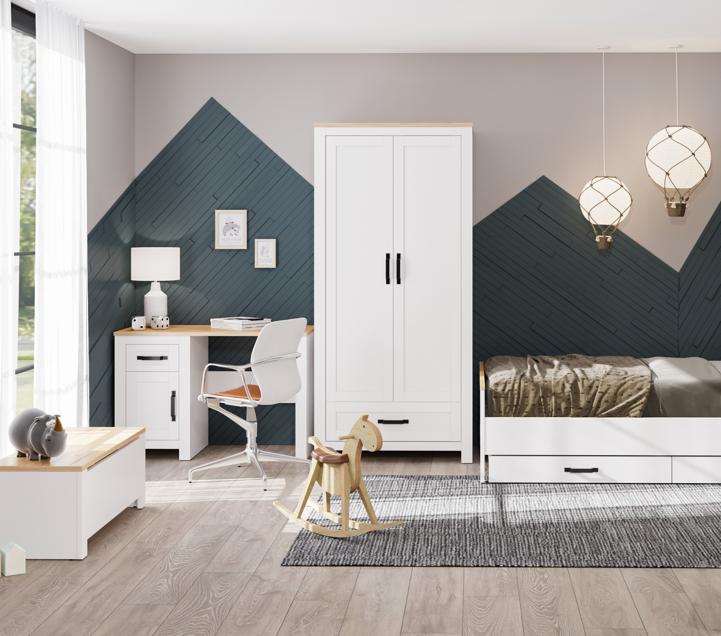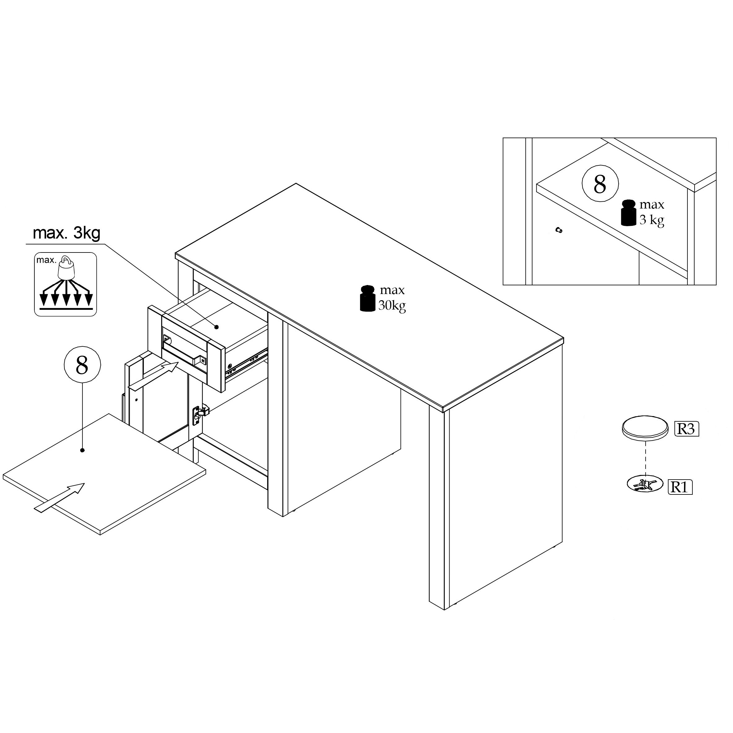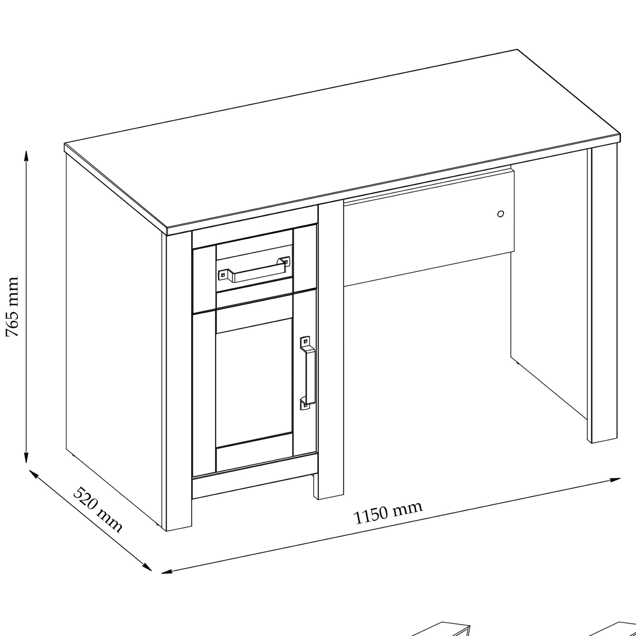 Miza je opremljena s kabinetom z enimi vrati in eno polico v notranjosti omare. Nad to omaro je en predal na krogličnih vodilih. To vam bo omogočilo enostavno organiziranje predmetov, ki jih potrebujete, tako da bodo vedno na dosegu roke. Tako predal kot notranja polica imata maksimalno nosilnost do 3 kg.