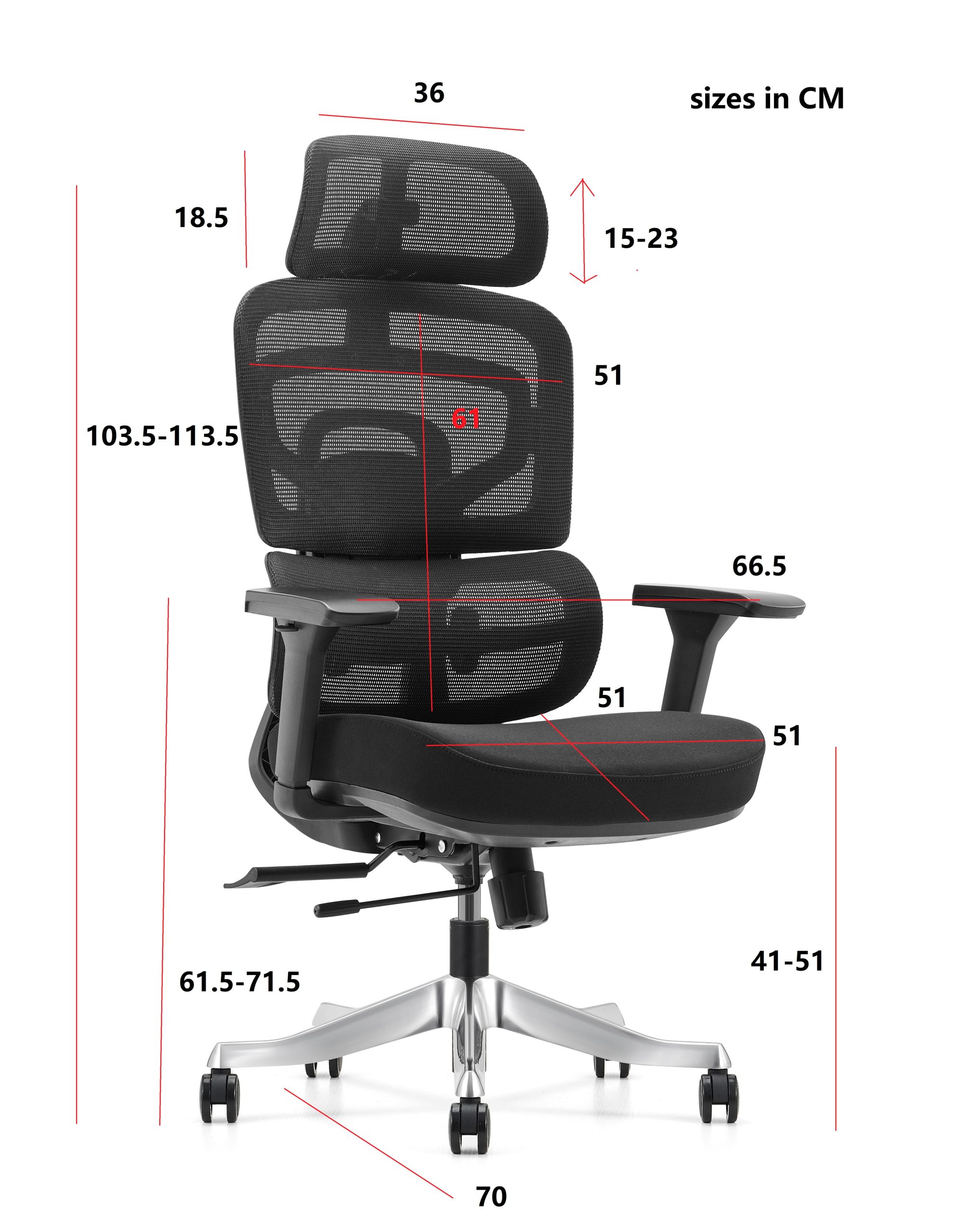 Ima 3D nastavljivo naslonjalo za glavo za prilagodljivo oporo za glavo in vrat. Rokonasloni so v celoti 4D nastavljivi in izdelani iz PU, ter omogočajo nastavitev višine, kota, globine in prečne nastavitve za izjemno prilagodljivost, ki je mogoča le pri redkih pisarniških stolih.