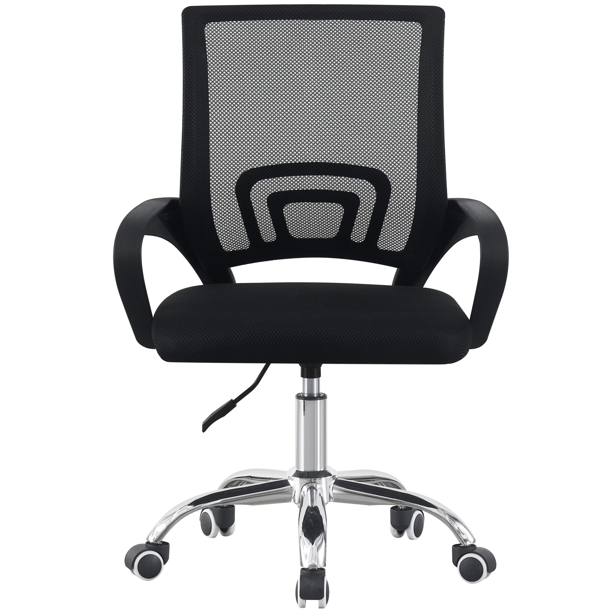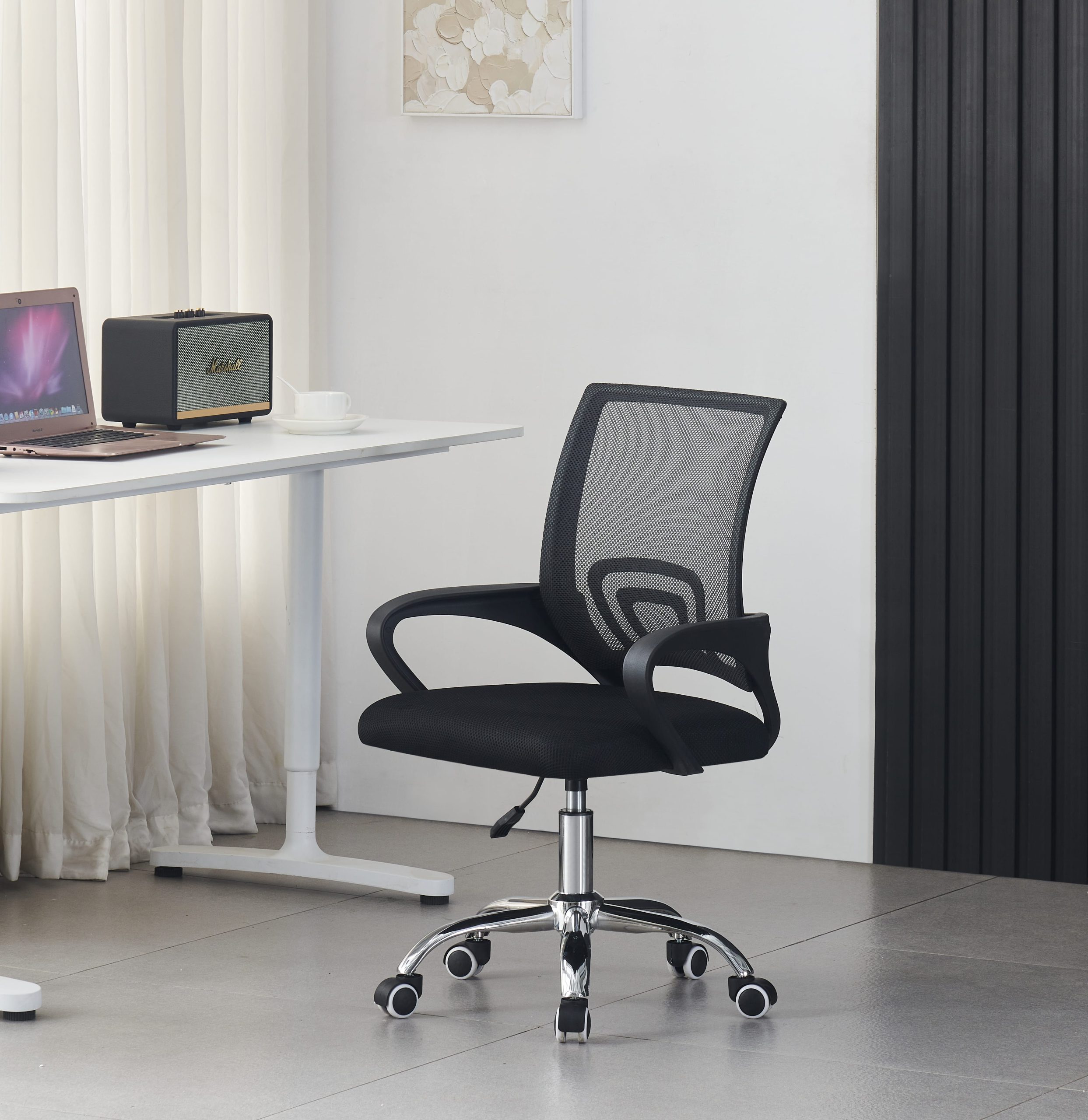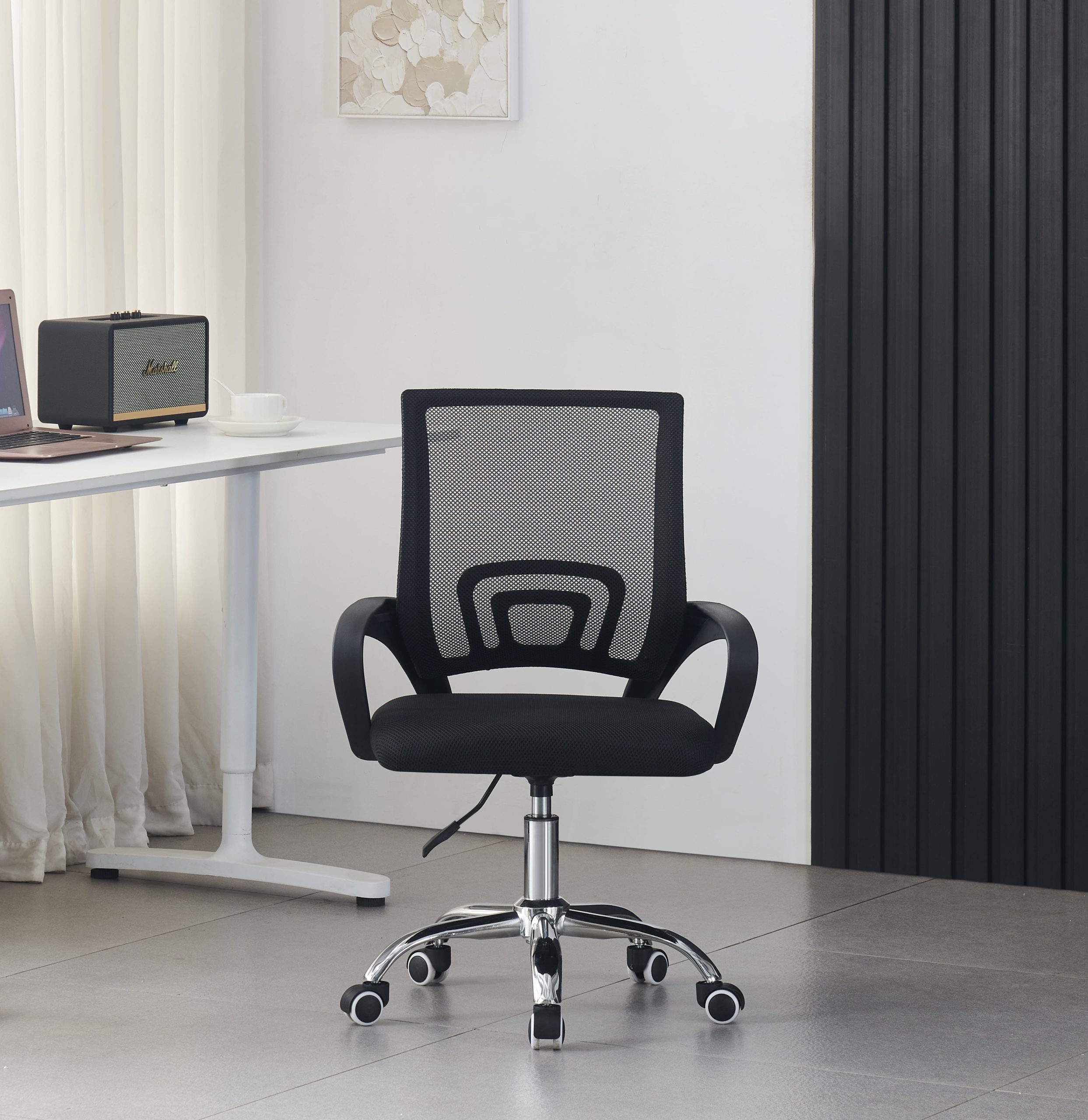Ergonomski pisarniški stol, izdelan iz kombinacije trpežnih materialov na modernem dizajnu, primernim tako za domače kot profesionalno pisarniško okolje. Stol ima ogrodje iz PP (polipropilena) in steklenih vlaken, kar zagotavlja trdno, a lahko strukturo, ki zagotavlja dolgoročno stabilnost brez nepotrebnega dodajanja teže.  Ta kombinacija materialov ponuja ravnovesje med togostjo in fleksibilnostjo, kar omogoča, da stol ohrani svojo obliko in oporo med vsakodnevno uporabo. Naslonjalo in sedež sta prekrita mrežasto tkanino, ki spodbuja pretok zraka in zagotavlja uporabniku udobje med daljšimi delovnimi urami. Mreža se prilagaja telesni obliki in zagotavlja enakomerno oporo. Prepustna prispeva tudi k toplotnemu udobju, zlasti v toplejših okoljih ali med dolgim ​​sedenjem. Mehanizem sedeža podpira jeklena ploščata osnova, ki povezuje podnožje z plinsko dvigalko razreda 2, ki omogoča gladko nastavitev višine ter tako zagotovi da se stol prilagodi različnim višinam miz in uporabnikovim željam, kar zagotavlja udobno delovno držo. Podnožje stola je izdelano iz kromirane kovine za čist, poliran videz. Kromirana površina povečuje vzdržljivost, ščiti površino pred praskami in korozijo ter olajša čiščenje. Petkrako podnožje zagotavlja stabilno porazdelitev teže, kolesca pa omogočajo gladko, večsmerno gibanje tako na trdih kot na preprogah. Maksimalna nosilnost stola je 120 kg. Uporaba mrežaste tkanine, lahkega kompozitnega okvirja in kromiranih nog tako daje tako vizualno prefinjenost kot funkcionalne lastnosti, potrebne za dolgoročno udobje v pisarni.
