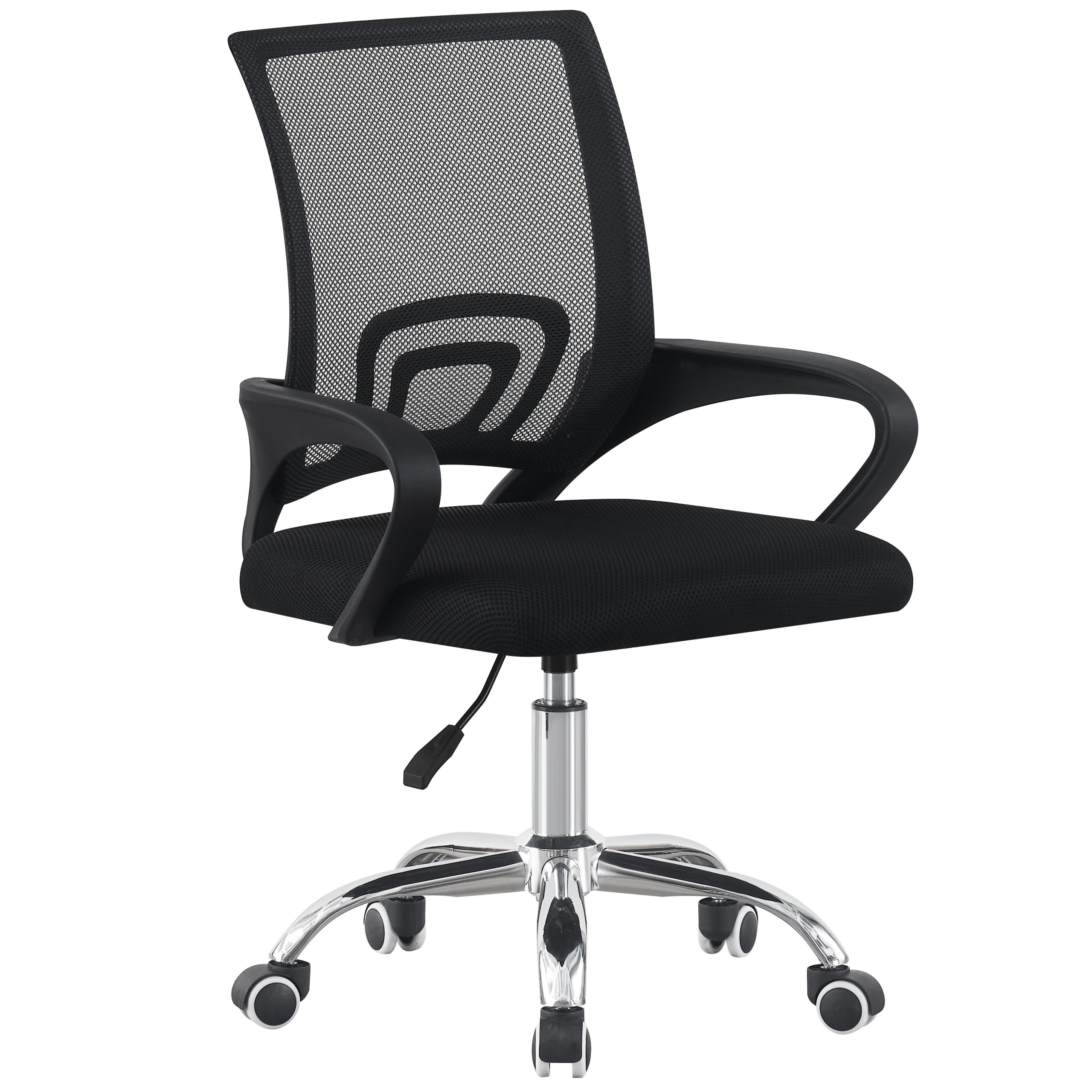 Pisarniški stol v črni barvi, nastavljiv po višini in 360° vrtljiv oblazinjen s prepustno mrežno tkanino na lahkem kompozitnem okvirju ter maksimalno nosilnostjo do 120 kg.