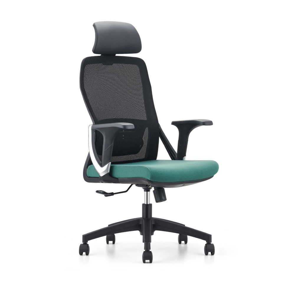 Črno-zelen pisarniški stol z mrežastim hrbtnim naslonom z ledveno oporo, po višini nastavljivim vzglavnikom in fiksnimi rokonasloni.