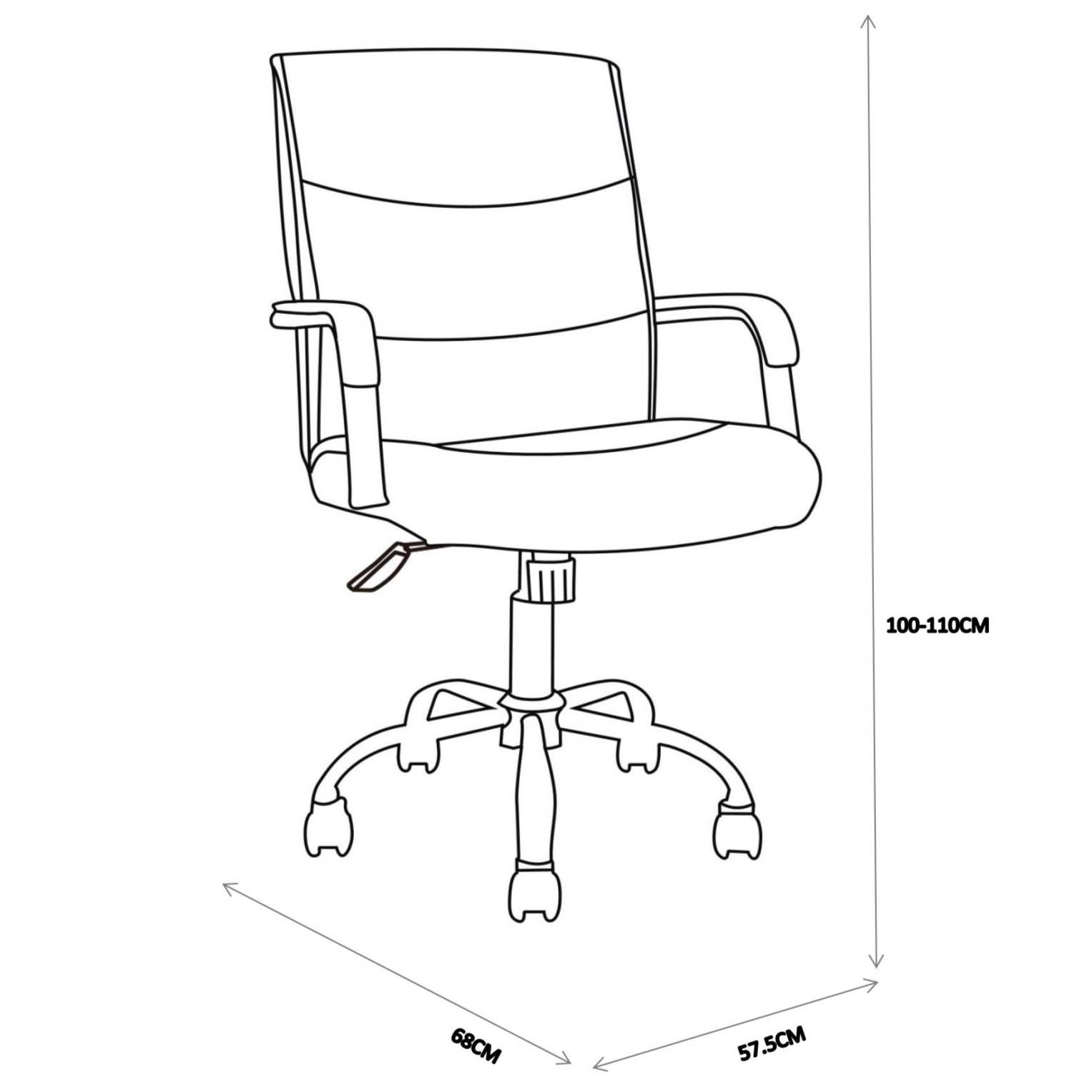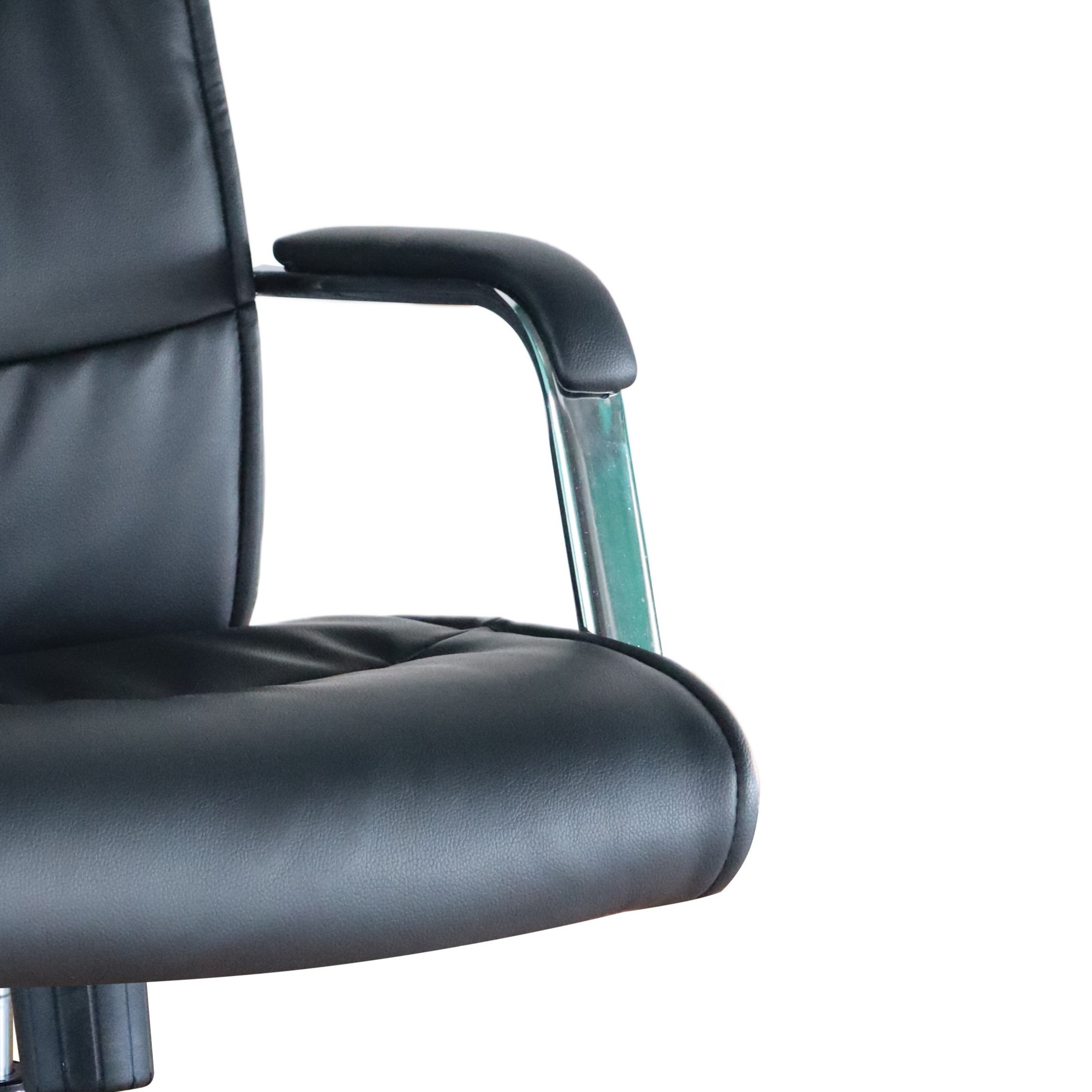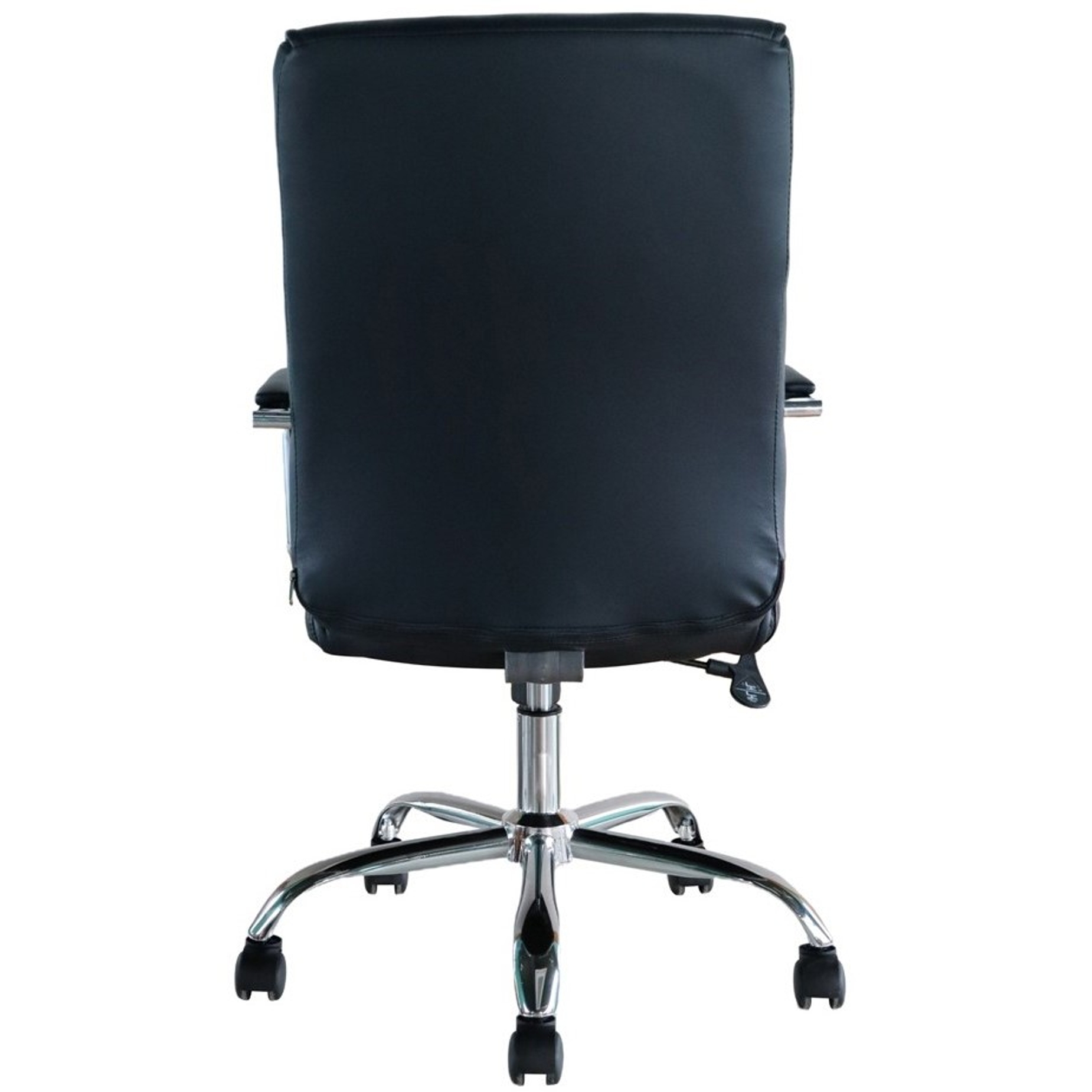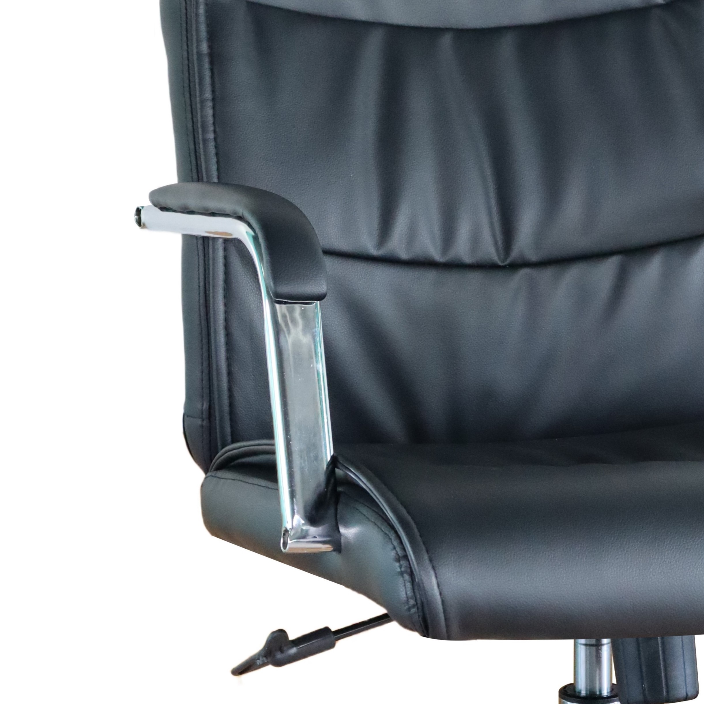 Sodoben pisarniški stol, na voljo v črni barvi. Stol je vrtljiv za 360° in nastavljiv po višini s plinskim mehanizmom v glavnem podpornem stebričku. Fiksni rokonasloni so za boljše udobje na vrhu oblazinjeni. Podnožje stola je narejeno iz kovine, s sijočim kromiranim finišem in črnimi kolesci.