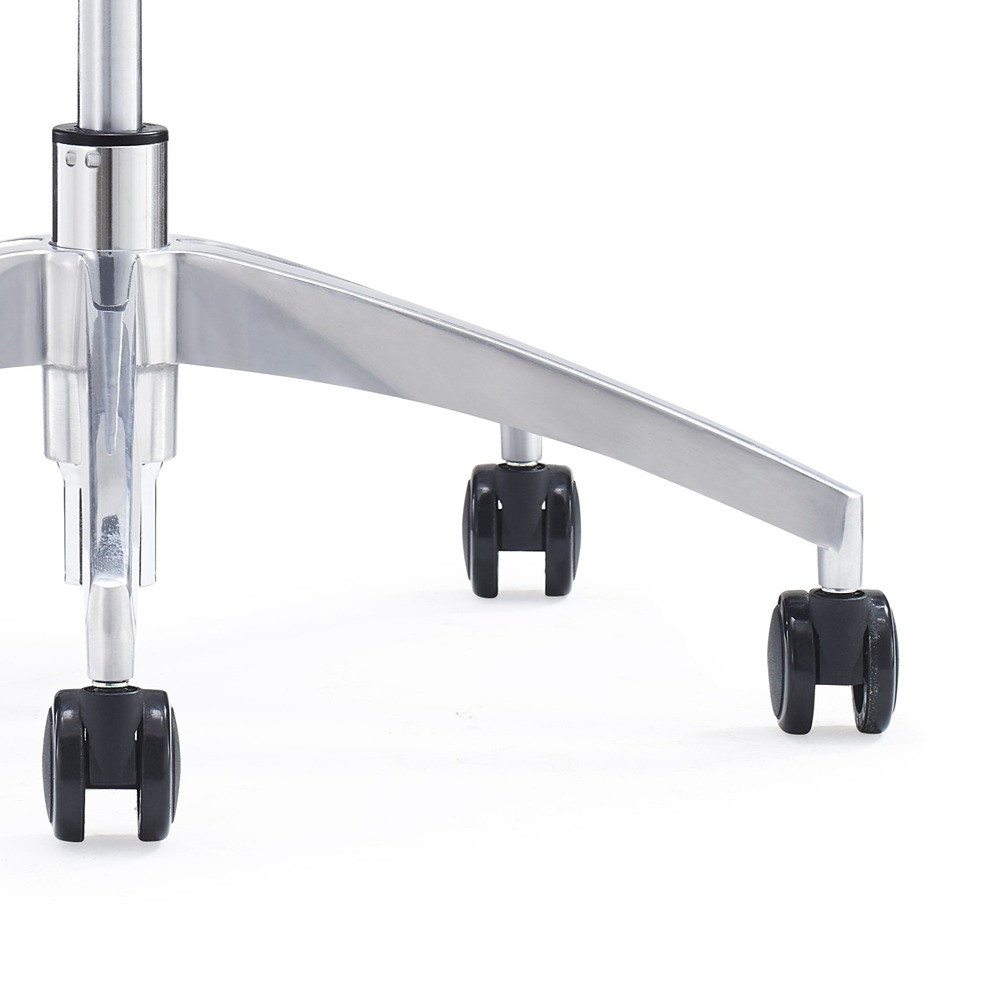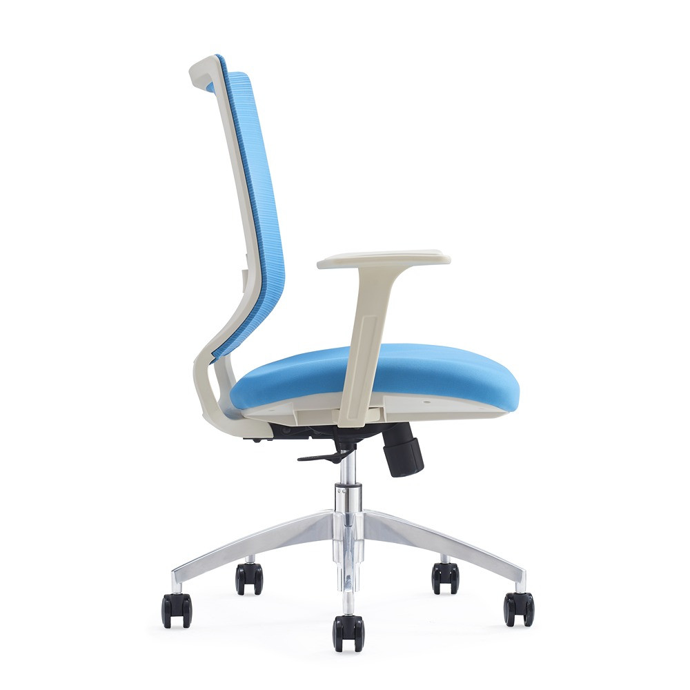Preprost pisarniški stol oblazinjen s kvalitetno mrežno tkanino. Stol je čudovite modre barve. Je vrtljiv in nastavljiv po višini. Sedišče ima v notranjosti peno. Ogrodje stola in fiksni rokonasloni so bele barve in narejeni iz plastike. Stol je obogaten z enopozicijskim nagibnim mehanizmom. Belo podnožje je aluminjasto in ima 5 gumiranih kolesc v črni barvi. Maksimalna obremenitev stola je 110 kg.