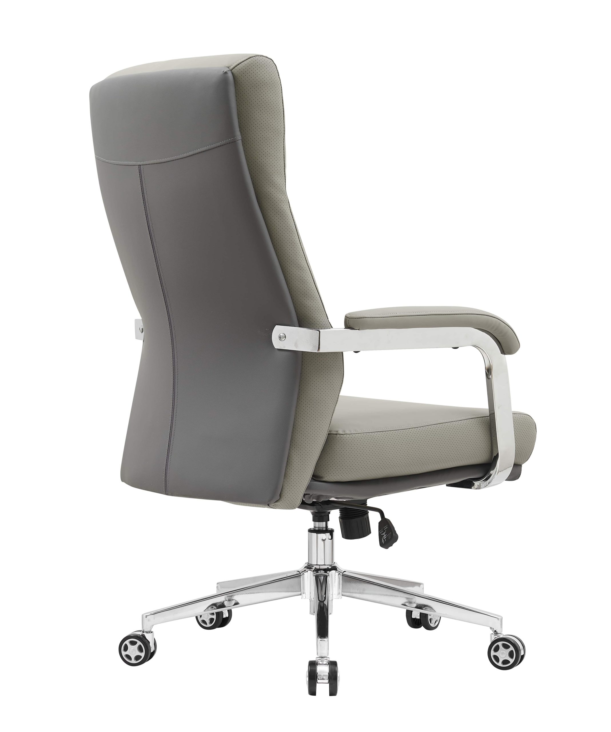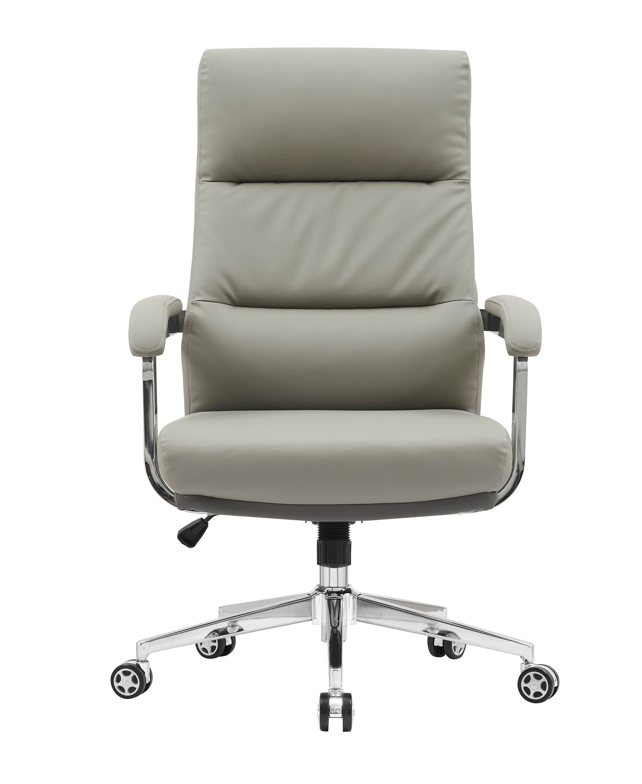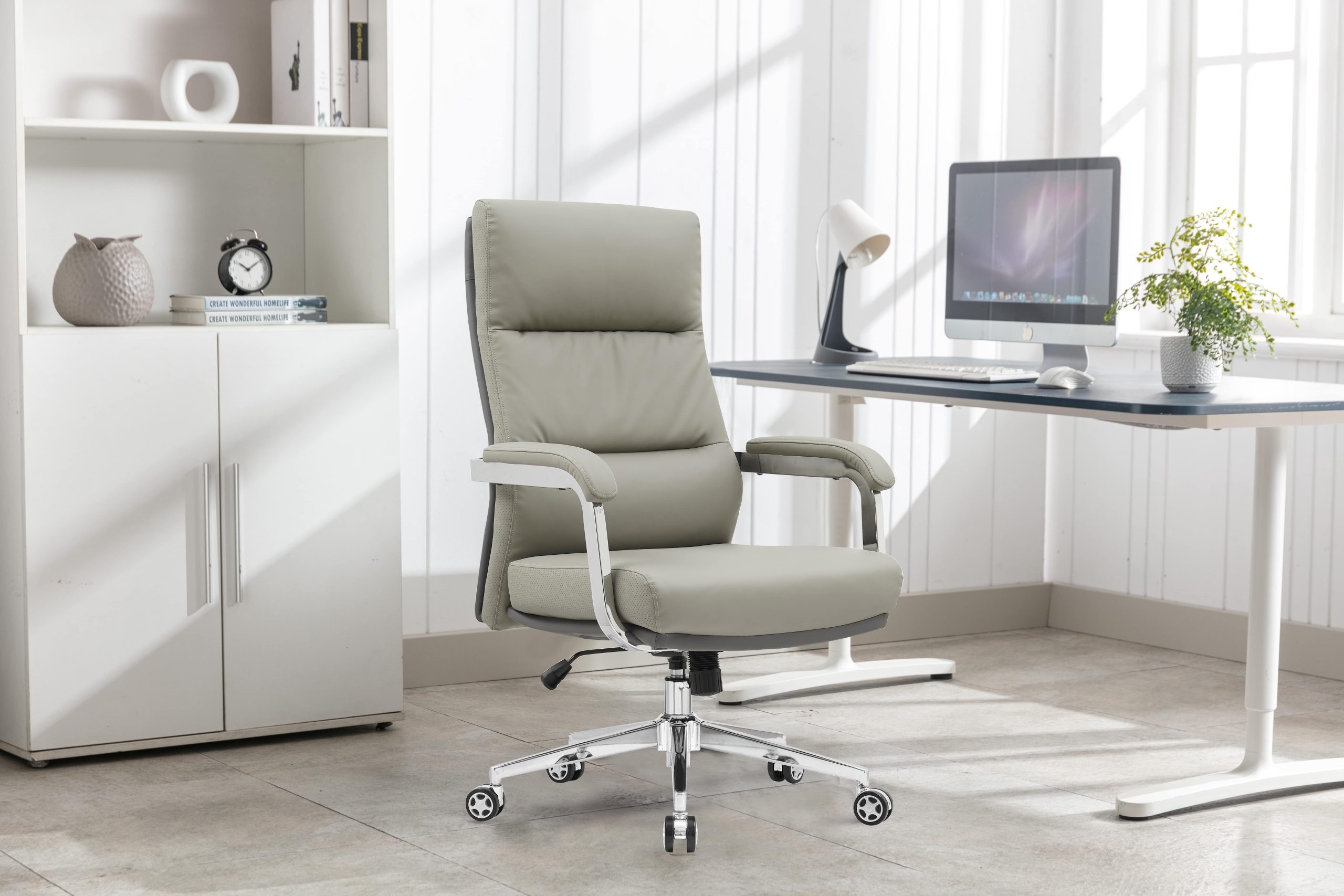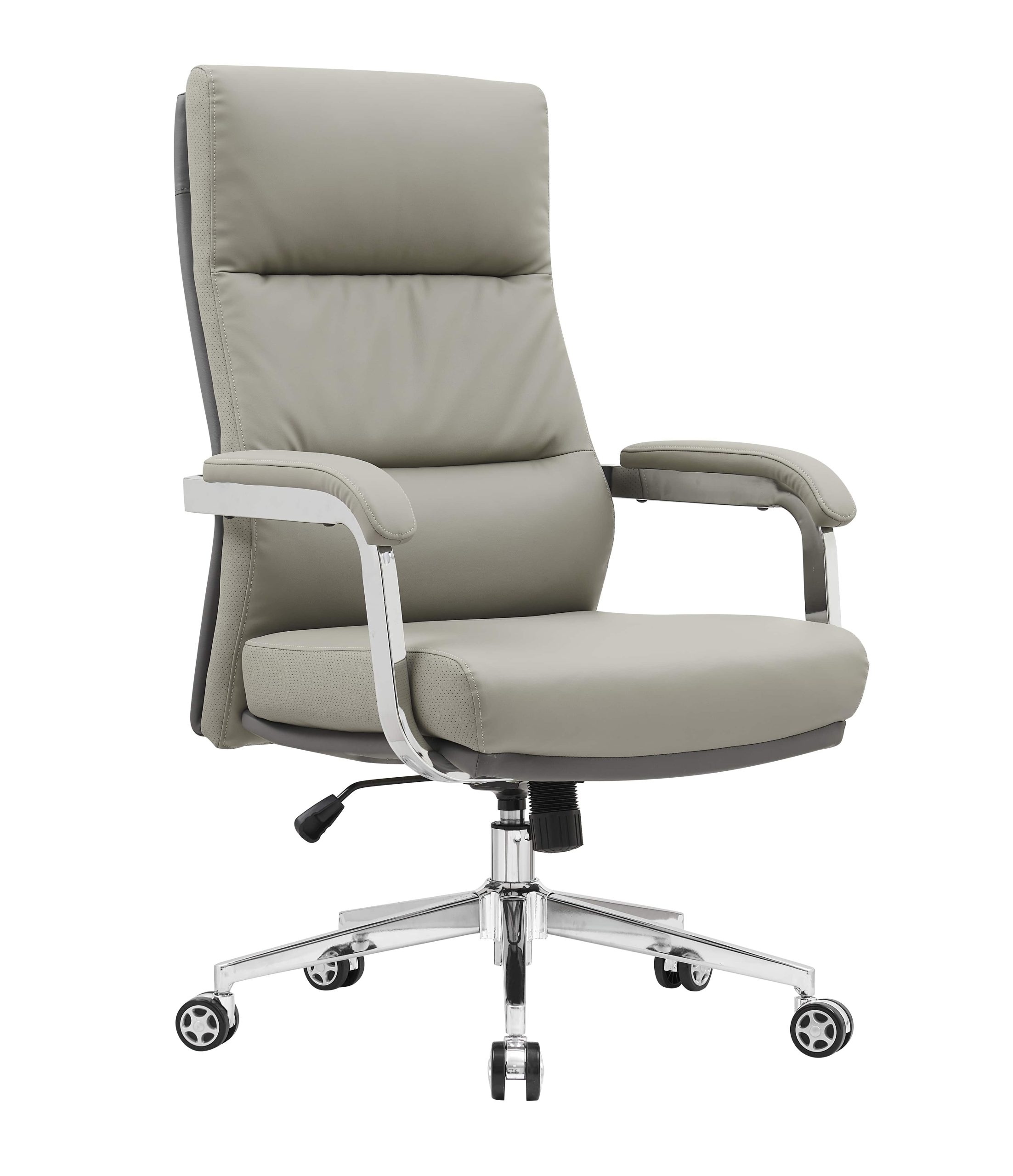 Sodoben pisarniški stol z visokim naslonom za hrbet, oblazinjen z umetnim usnjem taupe barve. Umetno usnje zagotavlja trpežno površino ki jo je enostavno čistiti in vzdrževati.