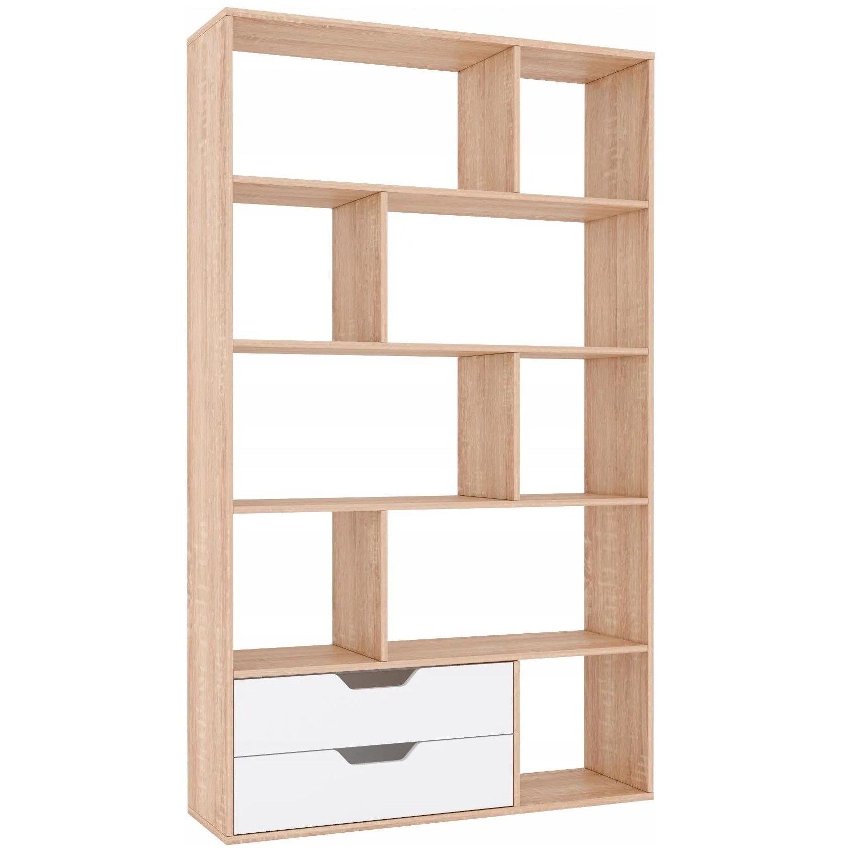 Poličnik z dvema predaloma ter asimetričnimi policami, na voljo v barvi sonoma hrasta z mat belimi frontami.