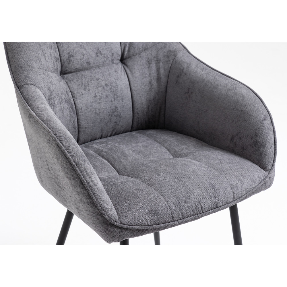 Jedilniški stol z integriranimi rokonasloni, oblazinjen z mehko tkanino in montiran na prašno lakirano kovinsko podnožje.