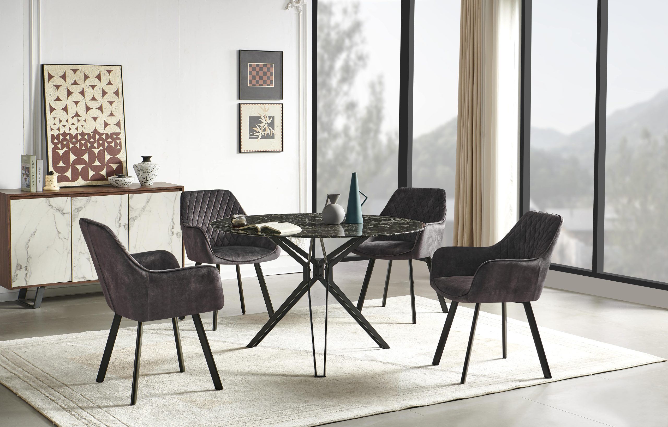 Stol ima visoko naslonjalo za hrbet, ki ob straneh gladko preide v oblazinjene rokonaslone, ki nudijo oporo ter ohranjajo udobje tudi ob dolgih večerjah ali drugih priložnostih ki se zavlečejo. Naslonjalo je tudi okrašeno z diamantnim šivanim vzorcem na sprednji strani, kar oblazinjenju doda zanimivo teksturo.