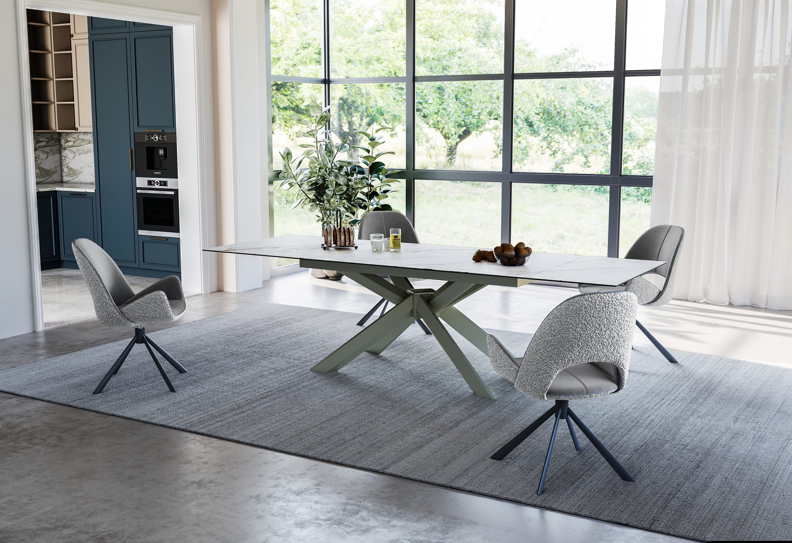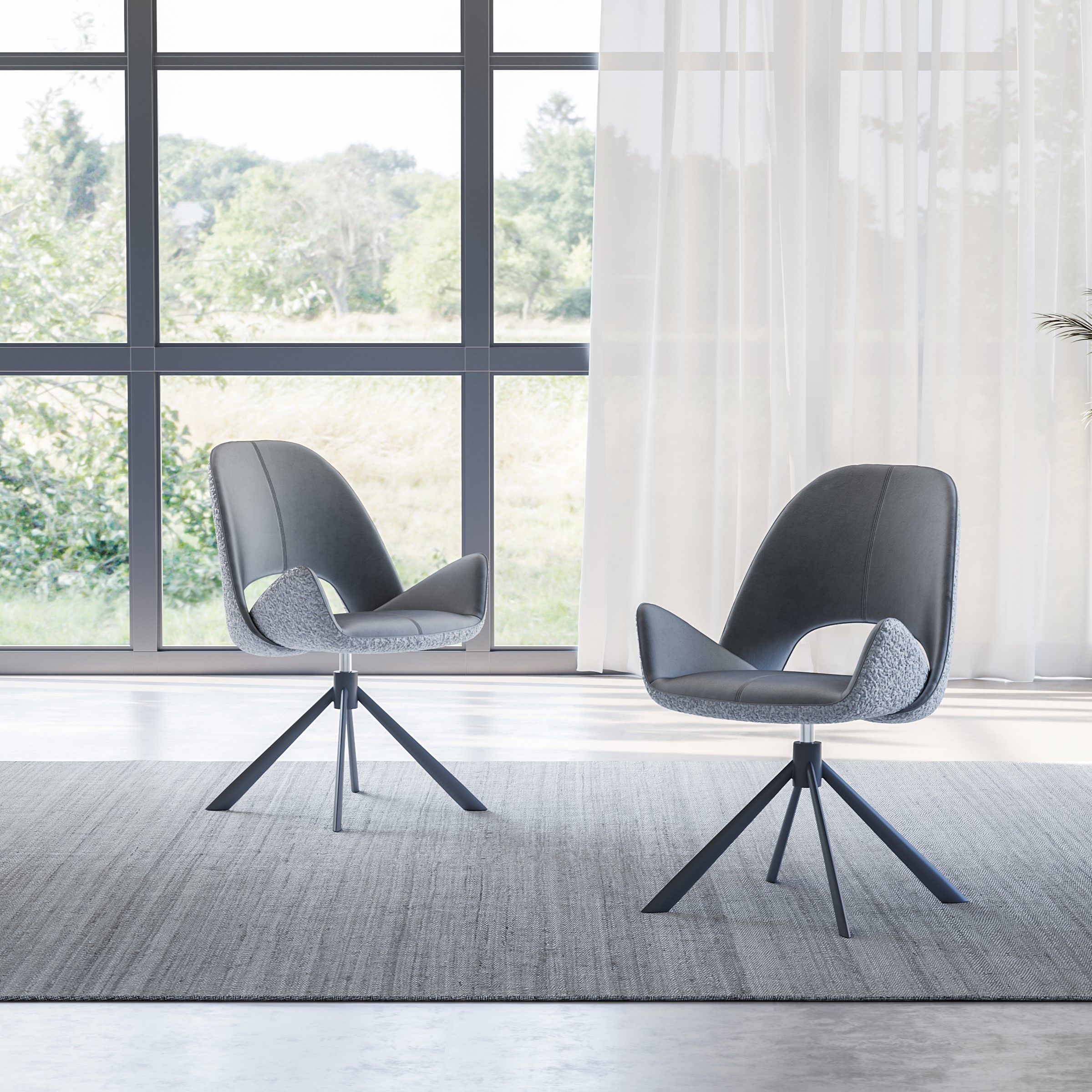 Udoben jedilniški stol z odprtim hrbtom ter 360° vrtilno funkcijo, na voljo v sivi barvi.