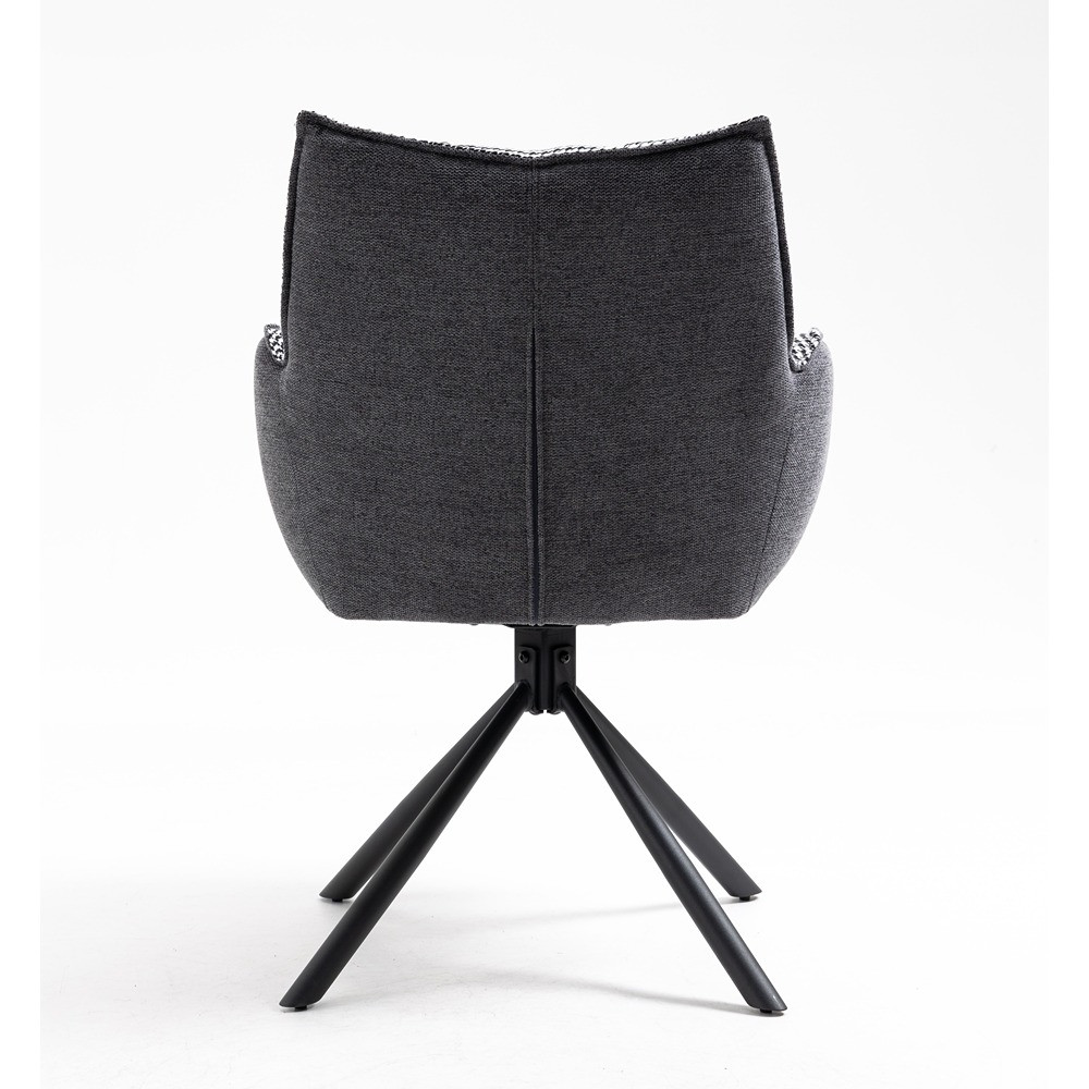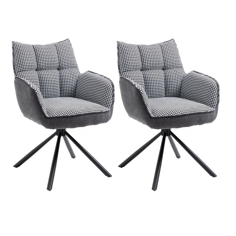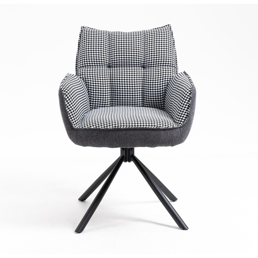 Čudovit jedilniški stol z žepkastim vzmetenjem, ki se bo odlično podal v vaš dom. Stol je oblazinjen s kvalitetno tkanino s črno-belim vzorcem po notranjih površinah sedišča, hrbtišča in rokonaslonov. Zunanje strani so obarvane v temno sivi barvi. Sedišče stola je opremljeno z vzmetenjem za udobnejše sedenje. Hrbtišče je prešito z okrasnimi šivi za lepši izgled. Višina oblazinjenih rokonaslonov je 66 cm. Podnožje je izdelano iz kovine in prašno lakirano v črno barvo za boljšo zaščito. Stol se lahko zavrti za 180°. Maksimalna nosilnost stola je 120 kg.