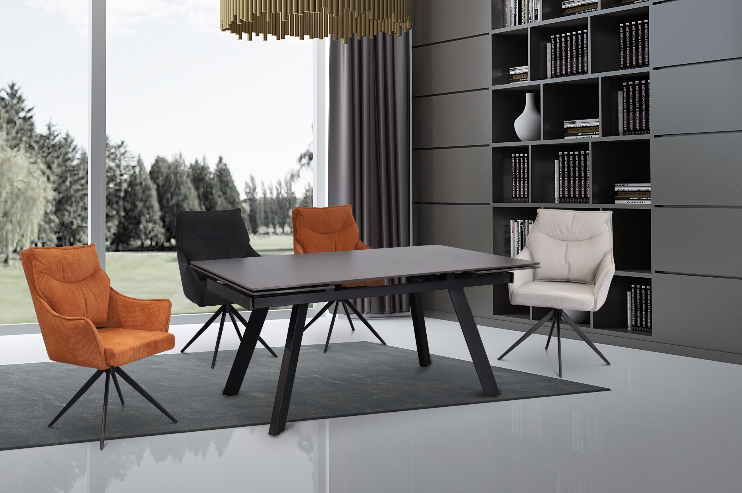 Sodoben jedilniški stol je debelo oblazinjen z mehko tkanino in opremljen s tankimi, fiksnimi rokonasloni. Na voljo je več barvnih varijant, v temno sivi, rjavi ali bež izvedbi. Sedišče je debelo 8,5 cm, široko 43 cm in se nahaja na višini 50 cm od tal. Črno podnožje je izdelano iz kovinskih cevi, velikosti 3×1,5 cm in prašno lakirano za boljšo zaščito pred okoljem. Vrtilna plošča v podnožju omogoča da se lahko sedež zavrti za 360°. Stoli se lahko kombinirajo z mizami vseh vrst in so primeren dodatek za jedilnice, dnevne sobe, kuhinje ali celo za pisarne. Maksimalna nosilnost stola je 120 kg.