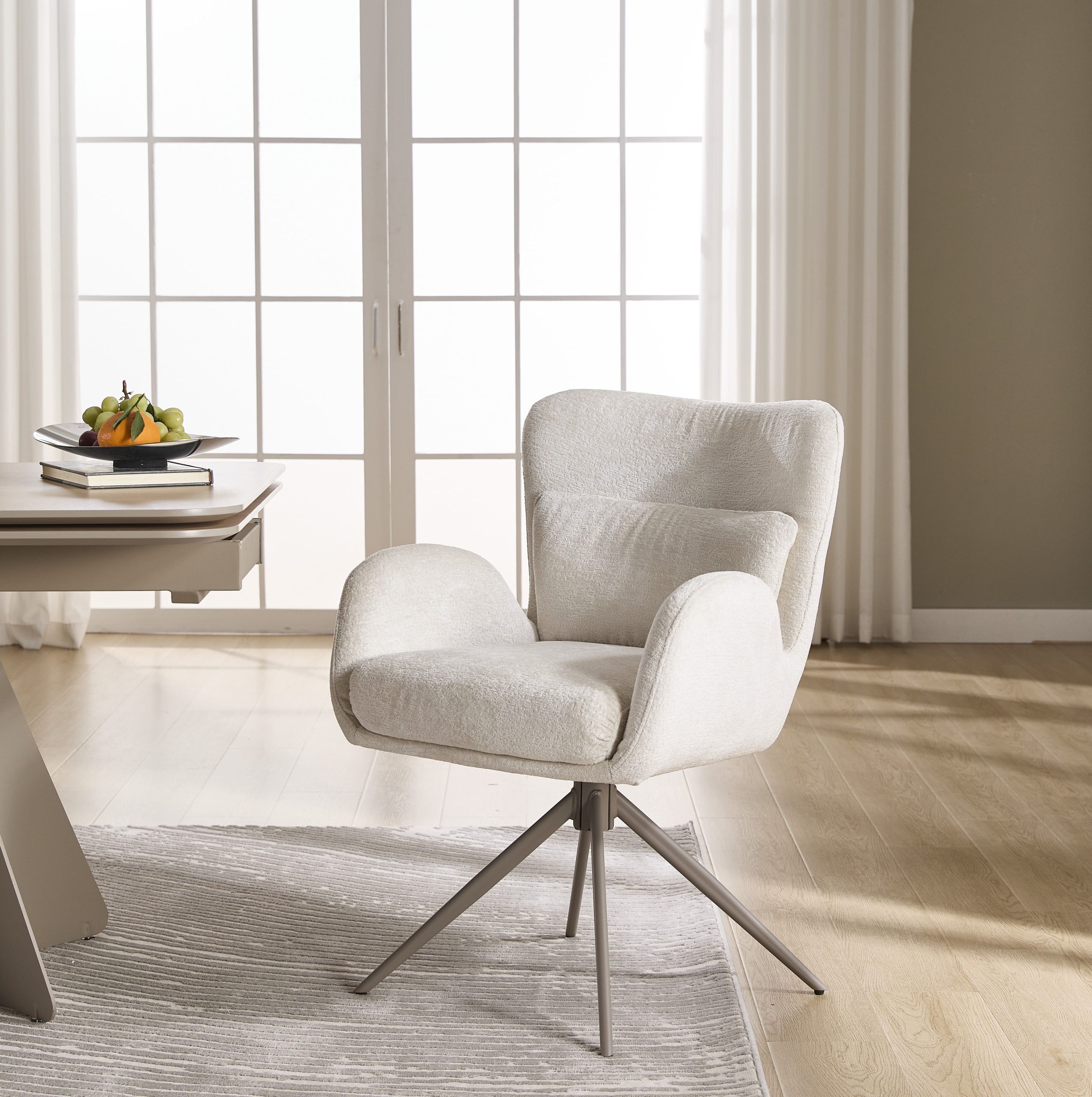 Jedilniški stol s funkcionalno zasnovo, primeren tako za stanovanjska kot poslovna okolja. Stol je povsem pokrit z mehko tkanino bež barve. Nasloni za roke in hrbtišče s svojo obliko zagotovijo udobje brez nepotrebnega dodajanja teže ter nudijo popolno oporo telesu, hkrati pa ohranja lahkoten in vsestranski videz.
