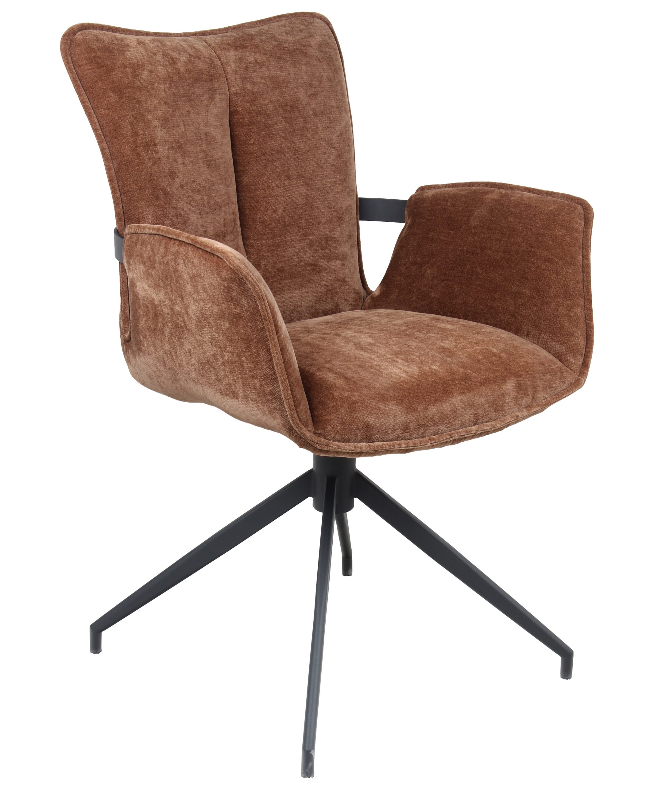 Jedilniški stol Timea z moderno silhueto, kombinirano z vrtilno funkcijo z avtomatskim vračanjem ter mehkim oblazinjenjem, za dodatek k različnim notranjim prostorom.