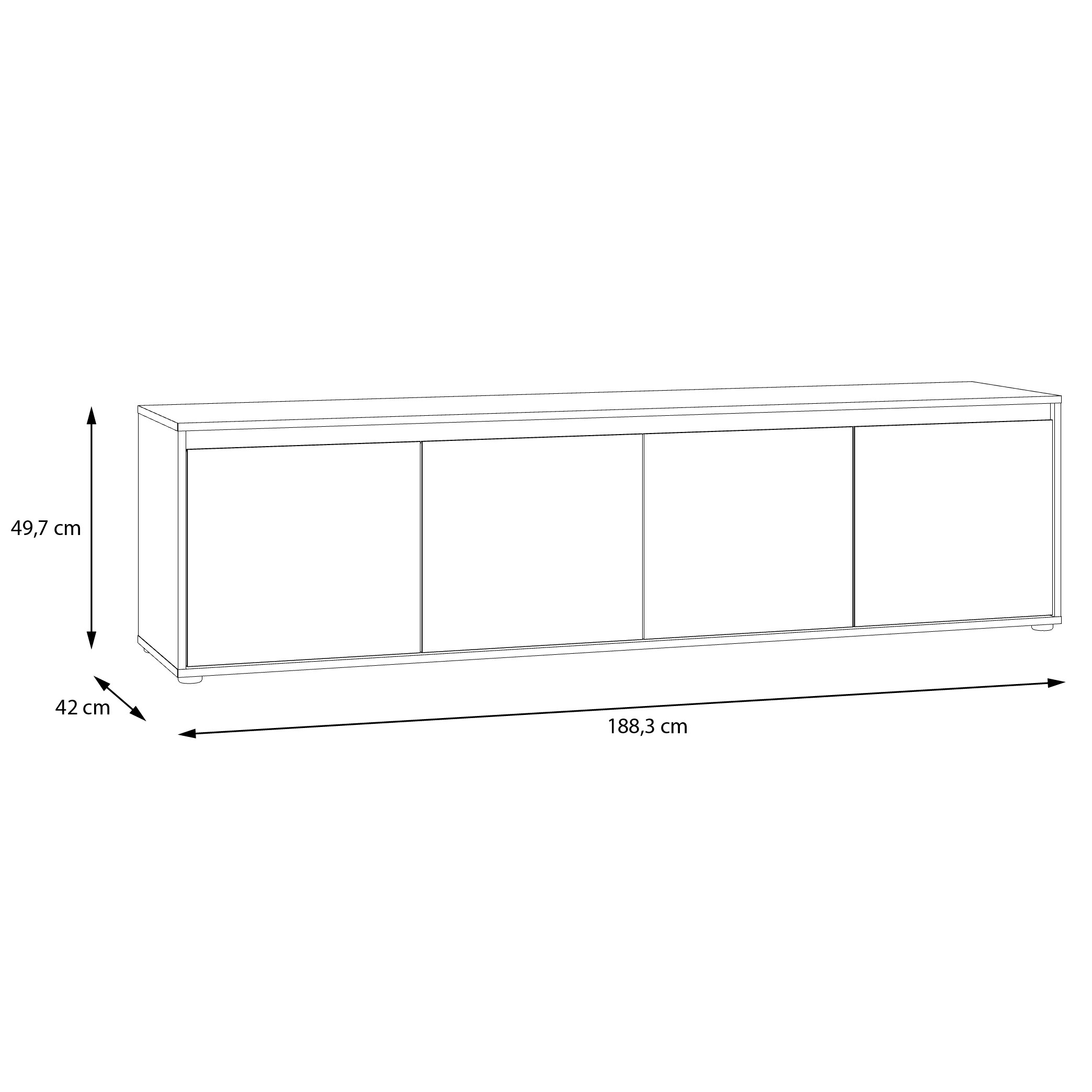 Komoda je izdelana iz kakovostnega iverala ter ponuja štiri enako velike predelke za vratci brez ročajev, kar omogoča skrito shranjevanje široke palete predmetov – od shrambe medijev kot so DVD-ji, daljinci, knjige do drugih gospodinjskih potrebščin.