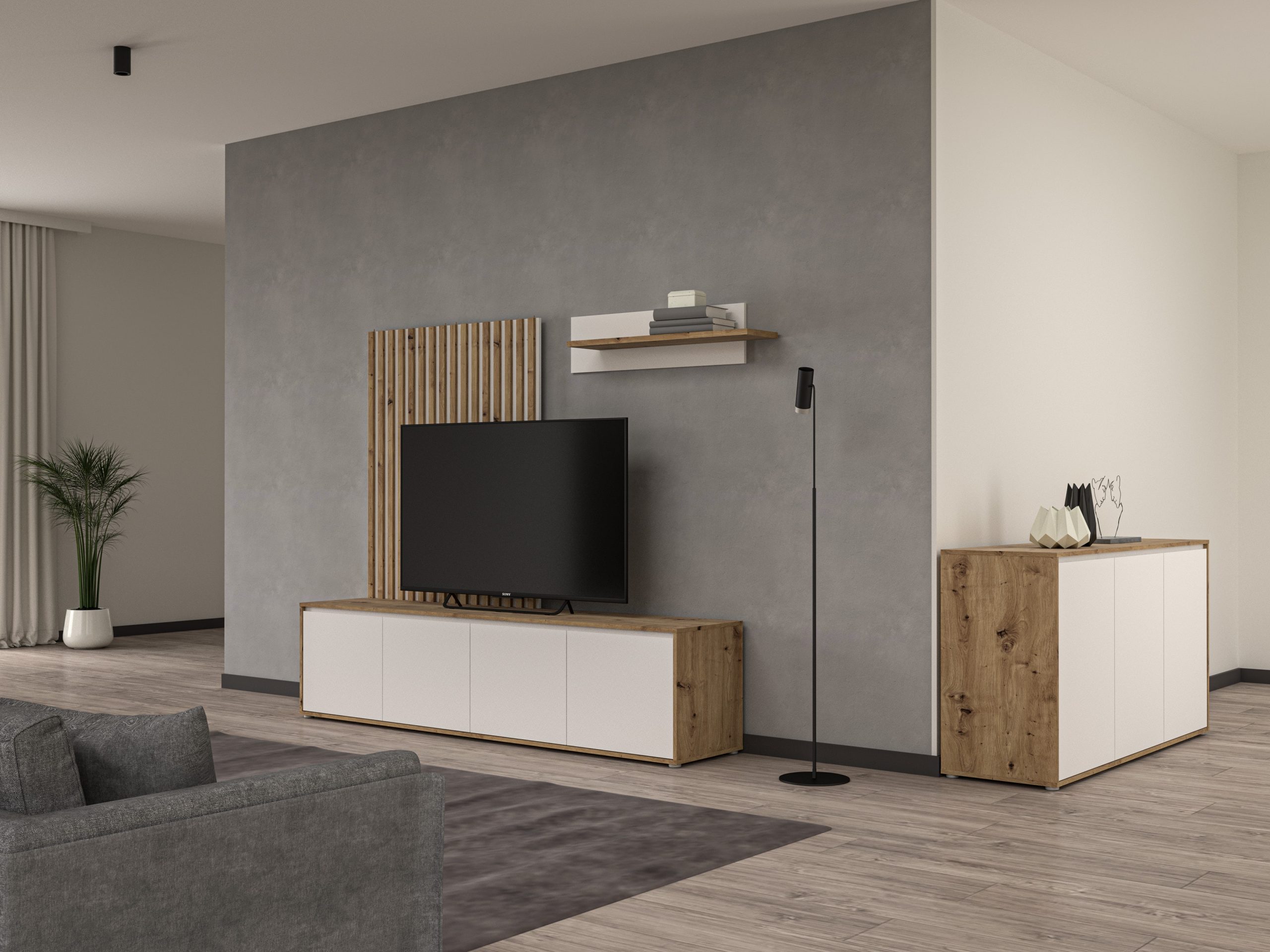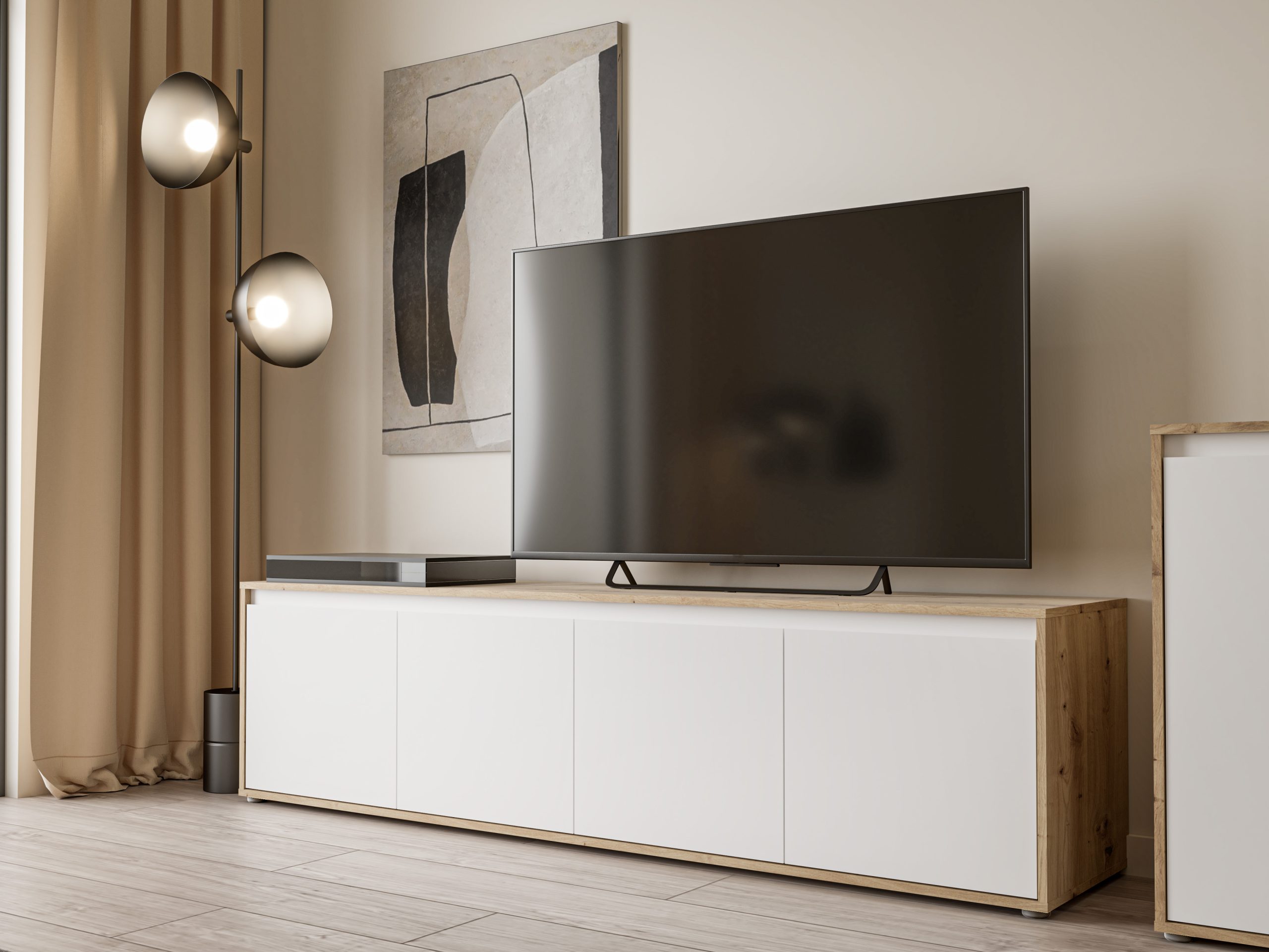 TV komoda, ki ponuja enostavno rešitev za namestitev televizije ter shranjevanje drugih stvari v skandinavskem, minimalističnem dizajnu. Z okvirjem v naravni barvi hrasta in štirimi mat belimi vrati je popolna za sodobne dnevne sobe.