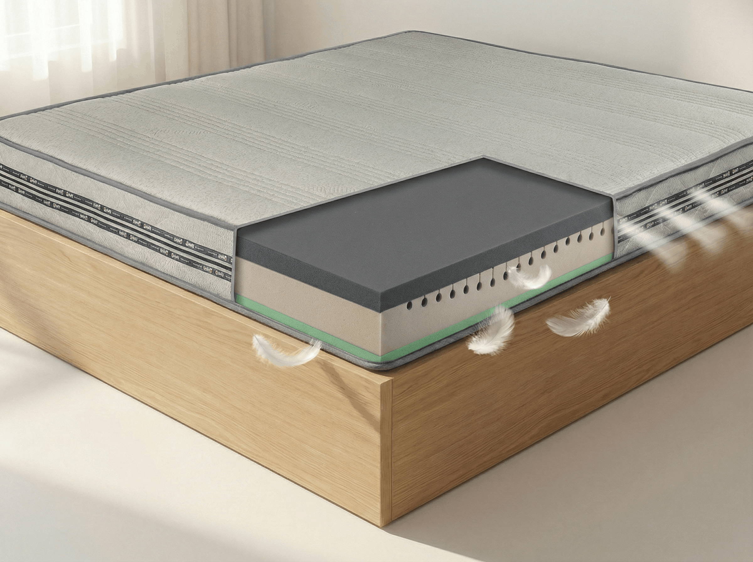 • Ekološka lepila na vodni osnovi: Za spajanje plasti vzmetnice se uporabljajo izključno lepila na vodni osnovi. Ta ne vsebujejo škodljivih topil ali hlapnih organskih spojin (VOC), kar pomeni, da vzmetnica nima neprijetnega vonja po kemikalijah in ne onesnažuje zraka v vaši spalnici.