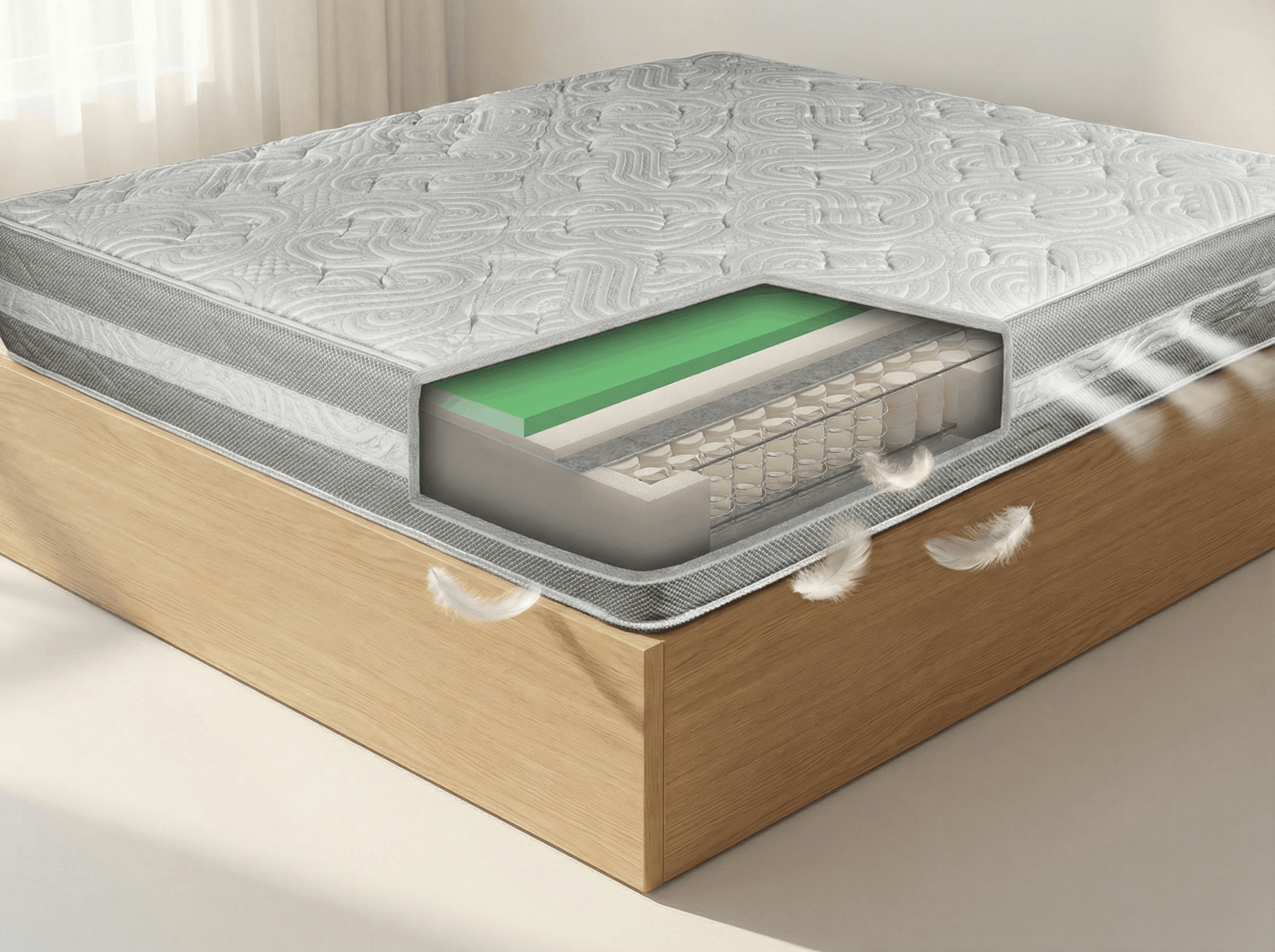 Termično obdelan filc: Izolacijski sloj filca, ki ščiti vzmeti, je obdelan termično, brez uporabe kemičnih veziv. Takšna obdelava zagotavlja večjo trdnost, hkrati pa je popolnoma varna za zdravje in primerna za najbolj občutljive uporabnike ter alergike.